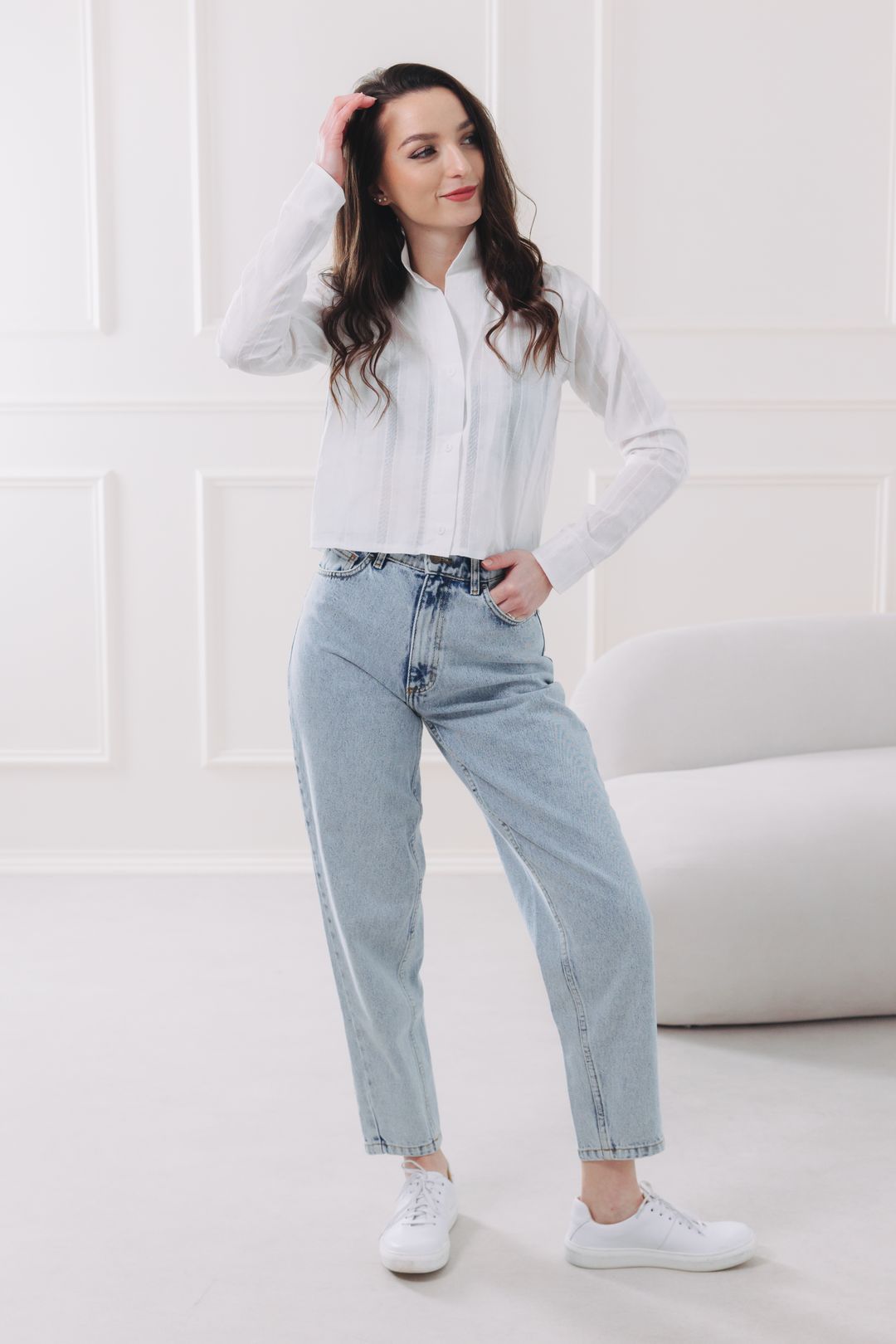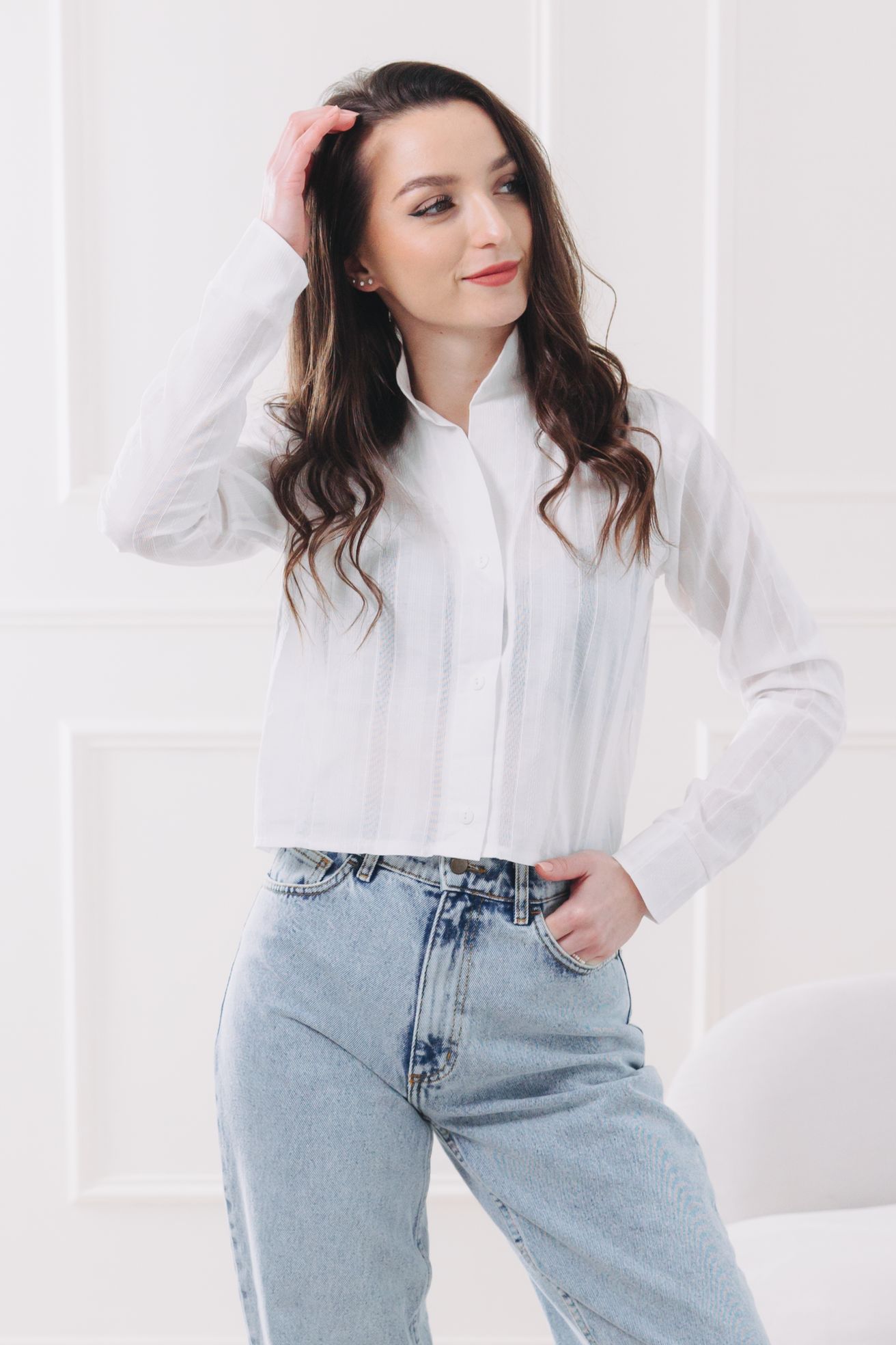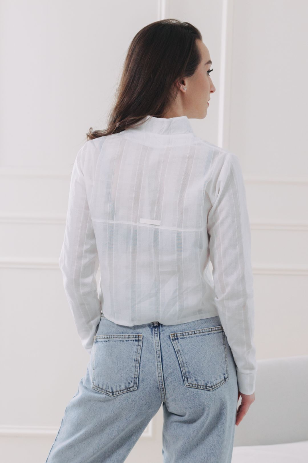 - Střih: Kratší, ležérnější střih (cropped) s dlouhým rukávem a elegantním stojáčkem. Ideální pro nošení ke kalhotám a sukním s vysokým pasem.
