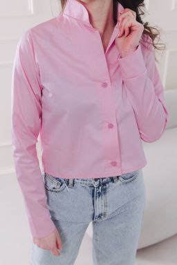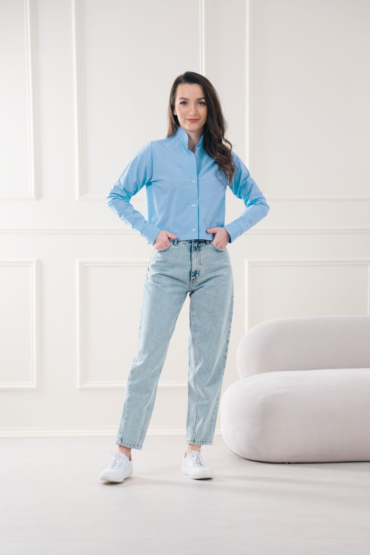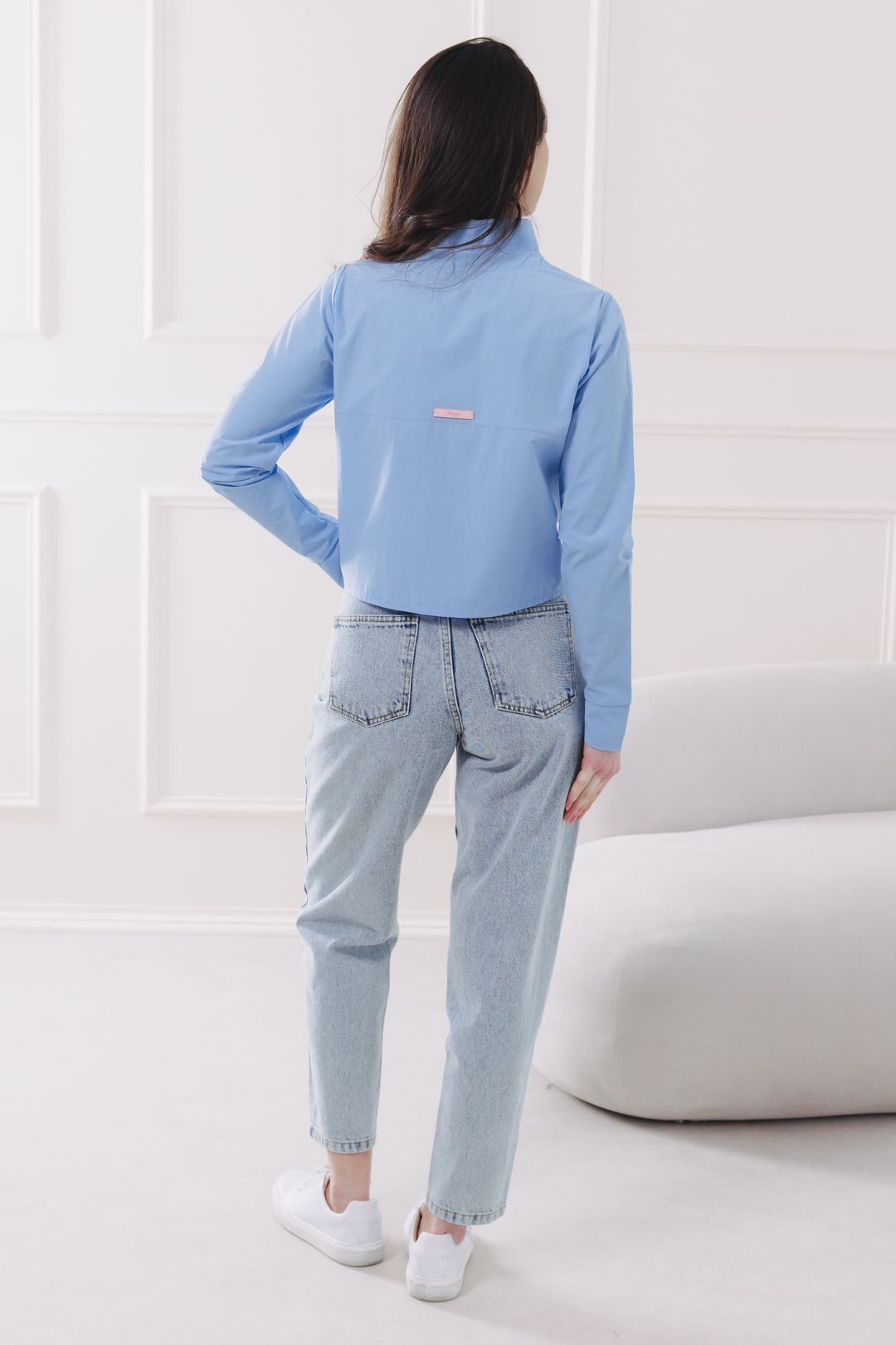 - Střih: Kratší, ležérnější střih (cropped) s dlouhým rukávem a elegantním stojáčkem. Ideální pro nošení ke kalhotám a sukním s vysokým pasem.