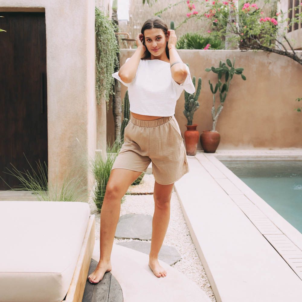 Akosua jsou díky vzdušnému mušelínu skvělou volbou právě do exotičtějšího počasí. Díky širokému střihu jsou stejně elegantní jako sukně, a přitom si ponechávají svoje „kraťasové výhody“.