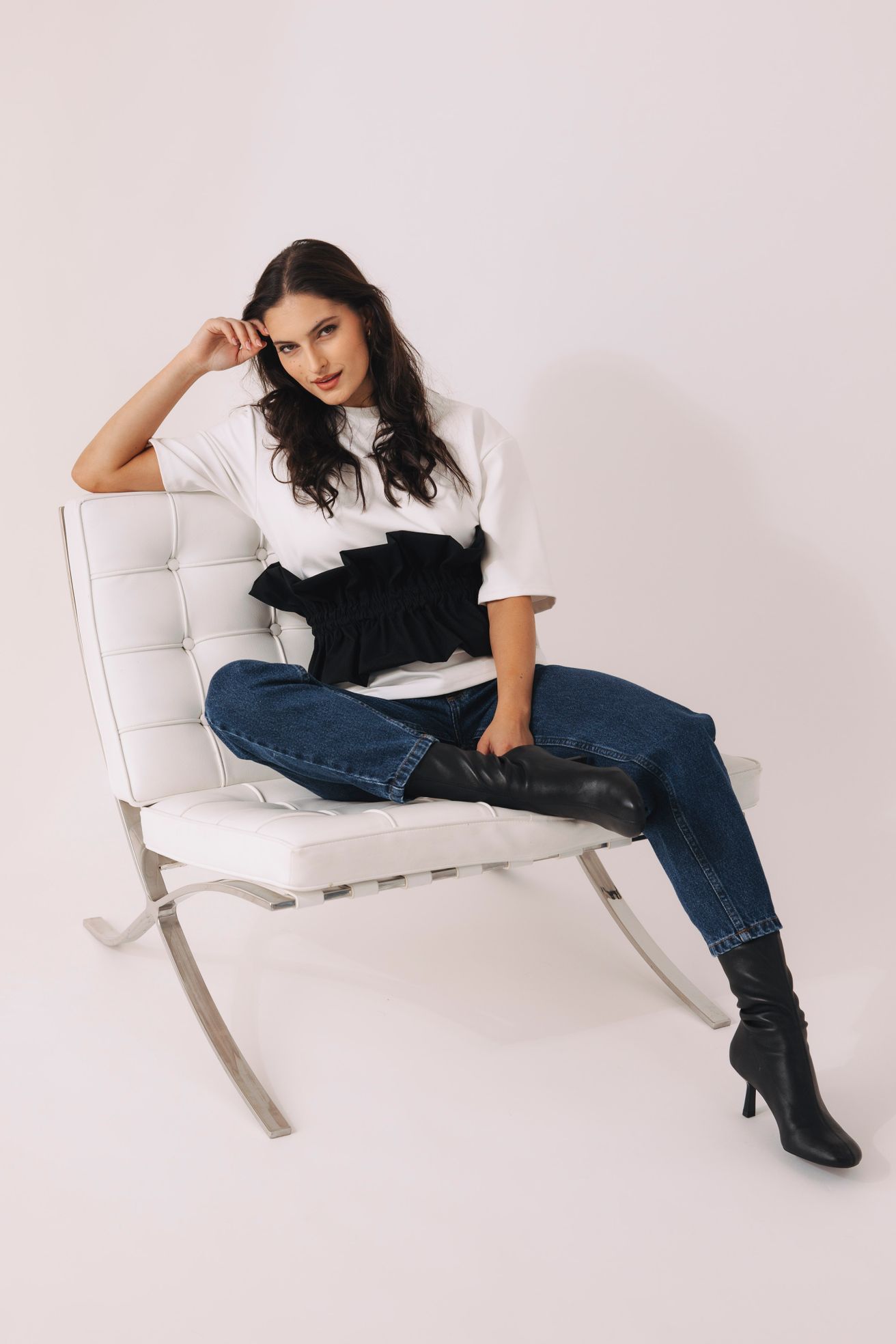 Vždy zdůrazněte vysoký pas. Klíčem je zastrčit top nebo zvolit krátký cropped svetr či bundu. Tím vizuálně prodloužíte nohy a zúžíte pas.
