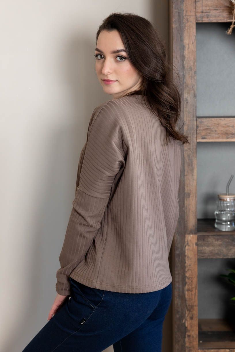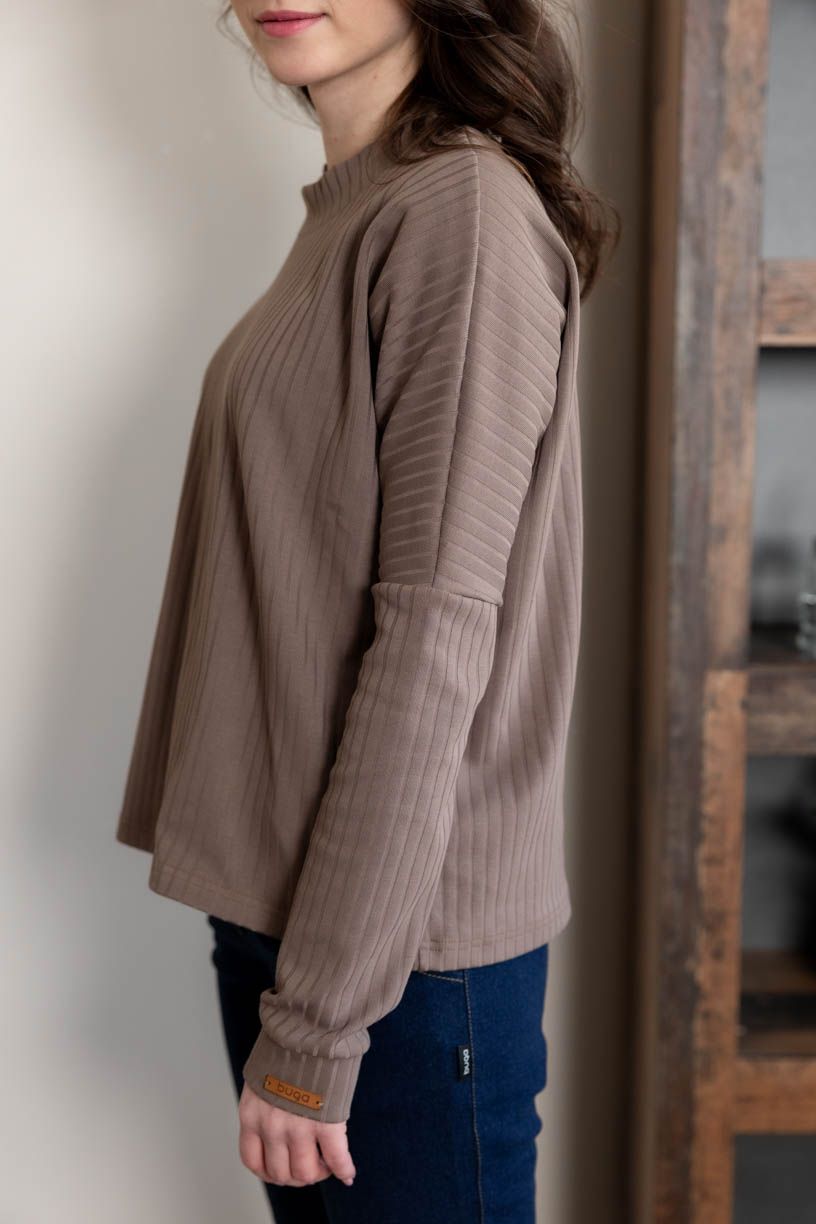 V jednoduchosti je krása. A v případě mikin to platí dvojnásob. Ada má klasický jednoduchý nekomplikovaný střih, jaký máme my úplně ženy nejradši – má dlouhé rukávy, elegantní lodičkový výstřih, mírně prodloužená délku. Šmrnc jí dodává neokoukaná kávová barva a taky výrazné vroubkování.