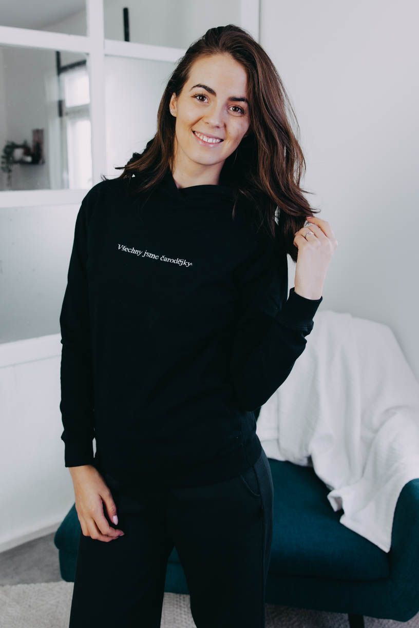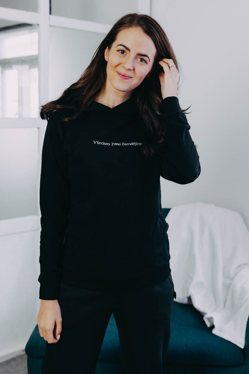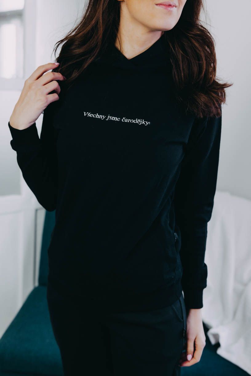 Nejenže mikina vypadá neodolatelně, ale každá mluví jasnou řečí. Velká kapuce se hodí, když zafouká nebo se cestou domů rozprší. Na dotek jemná, ale se silným poselstvím. Výšivka s heslem „Všechny jsme čarodějky“ oslavuje lehkost bytí, výjimečné okamžiky s těmi nejbližšími lidmi.