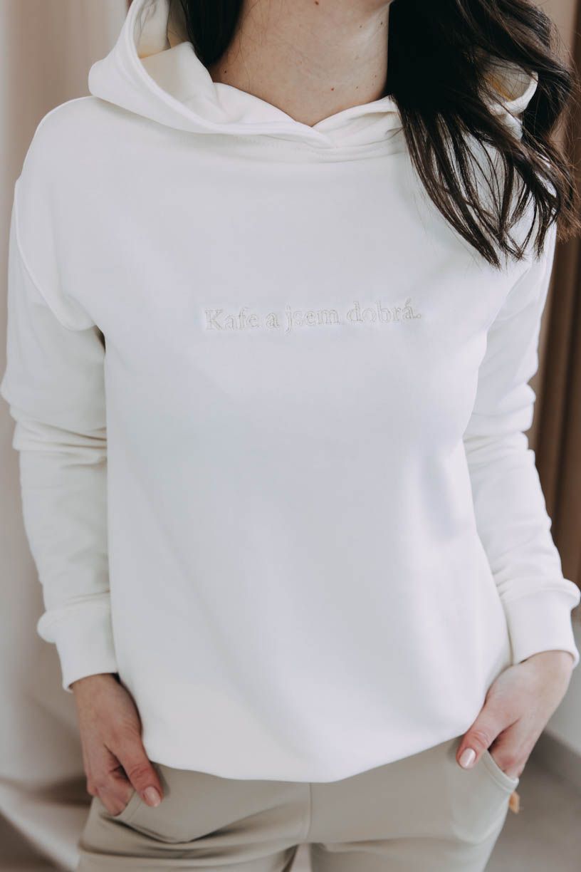 Nechte vaše oblečení promluvit. Smetanová mikča Iff s velkou kapucí z jemné bavlny to řekne za vás. 10 z 10 vášnivých kafařek potvrzuje pravdivost výšivky.