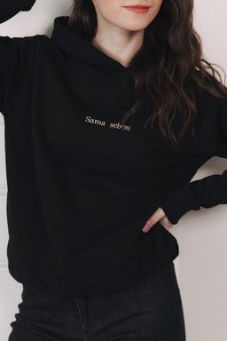 - Výšivka: Vyšitý nápis „Sama sebou“ na prsou je nápadný i nenápadný zároveň. Záleží jen na úhlu pohledu. Rozhodně však prozradí, že máte světu co říct.