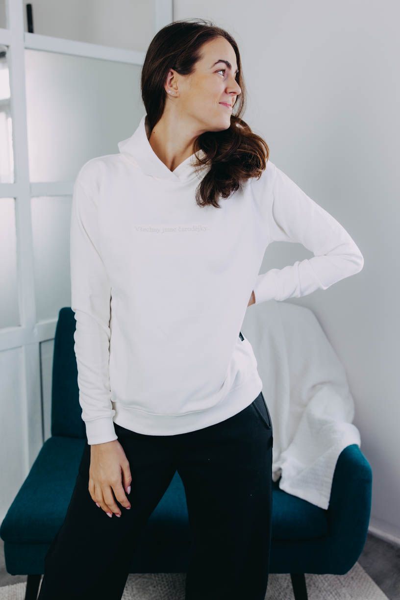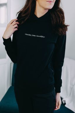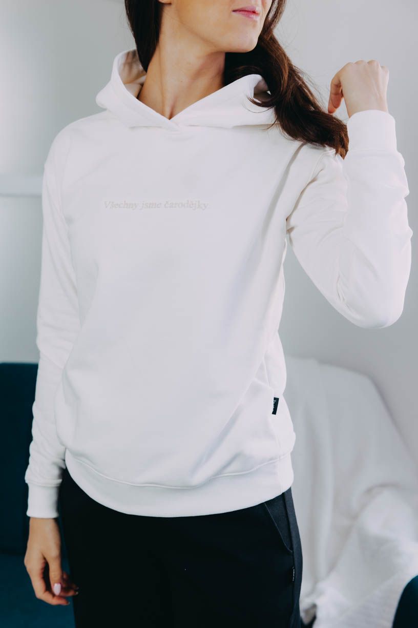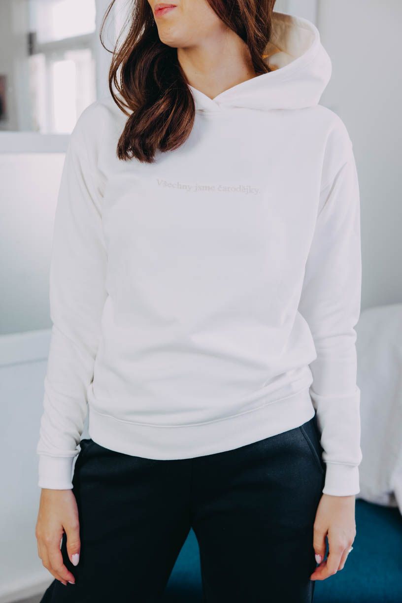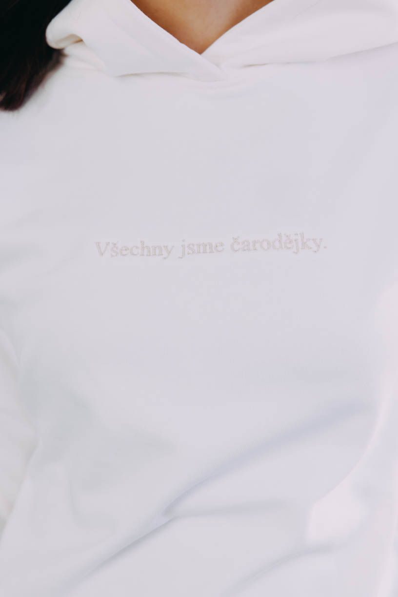 Nejenže mikina vypadá neodolatelně, ale každá mluví jasnou řečí. Velká kapuce se hodí, když zafouká nebo se cestou domů rozprší. Na dotek jemná, ale se silným poselstvím. Výšivka s heslem „Všechny jsme čarodějky“ oslavuje lehkost bytí a výjimečné okamžiky s těmi nejbližšími lidmi.