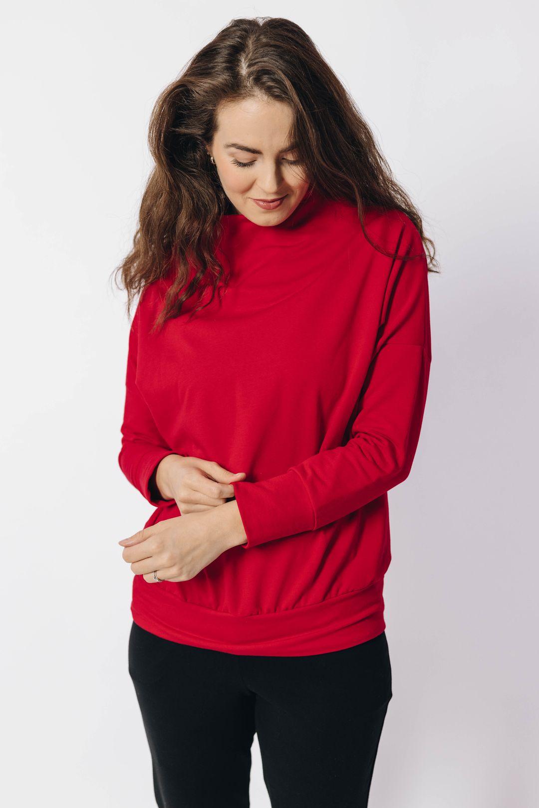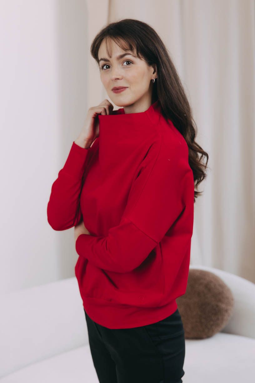 Mikina Izis Red s netopýřími rukávy a stojáčkem vychází střihově ze stejnojmenných svetrů. Jen materiál jsme vyměnili za prémiovou bavlnu OEKO-TEX.