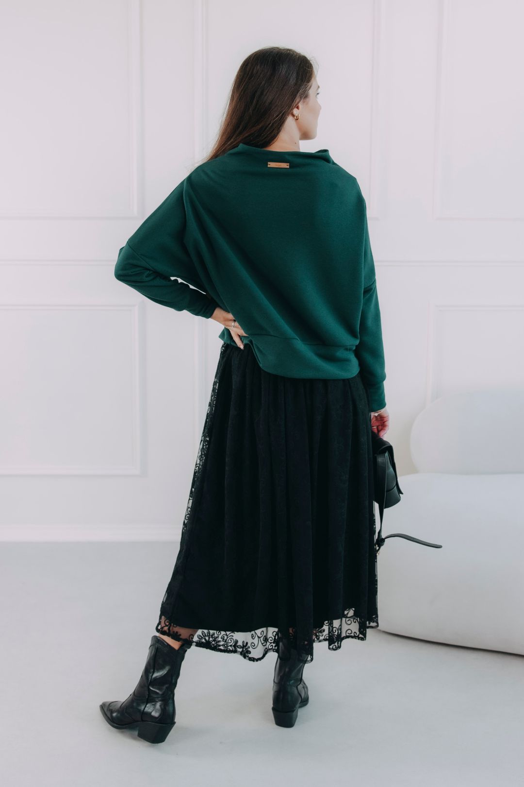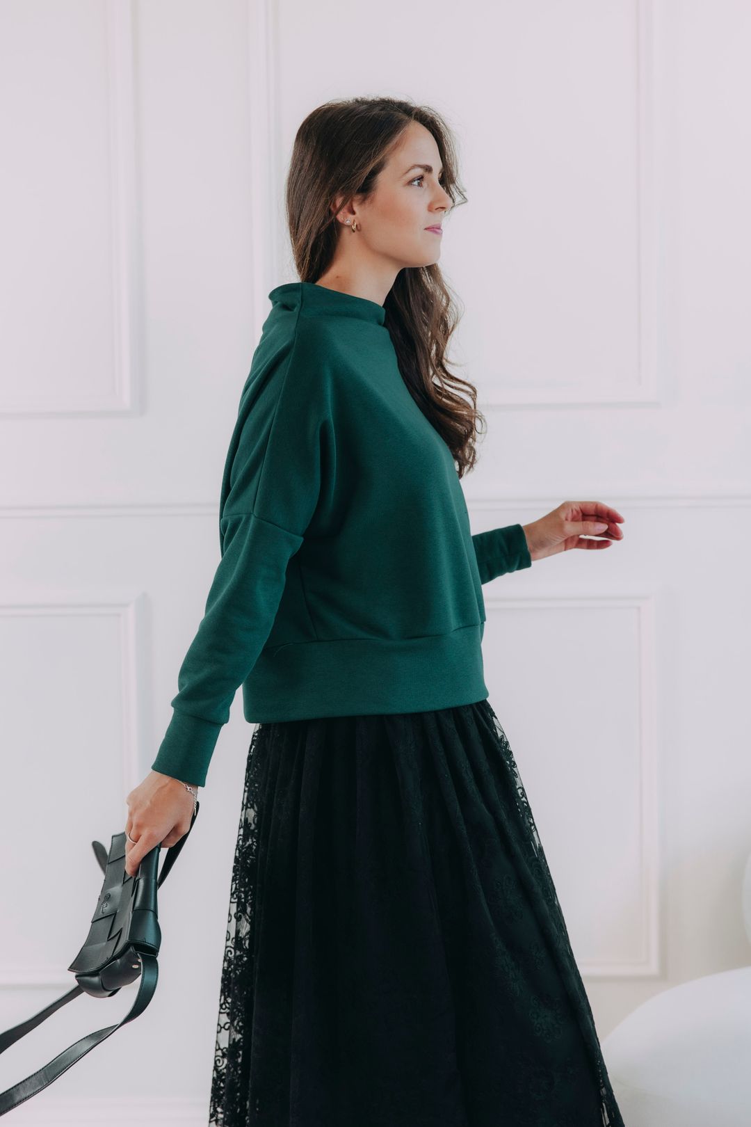 - Střih: Mikina má netopýří střih s mírně spadlými rukávy a spodním nápletem ze stejné látky. Její kratší délka, se navíc skvěle hodí k vysokým pasům.