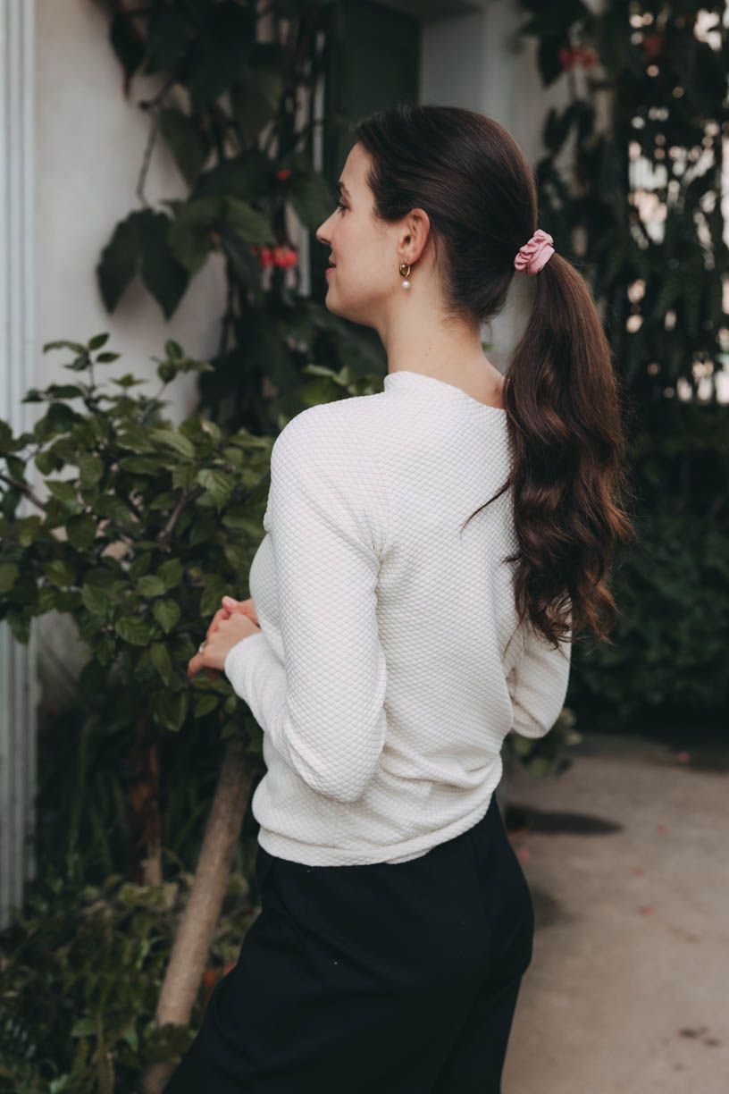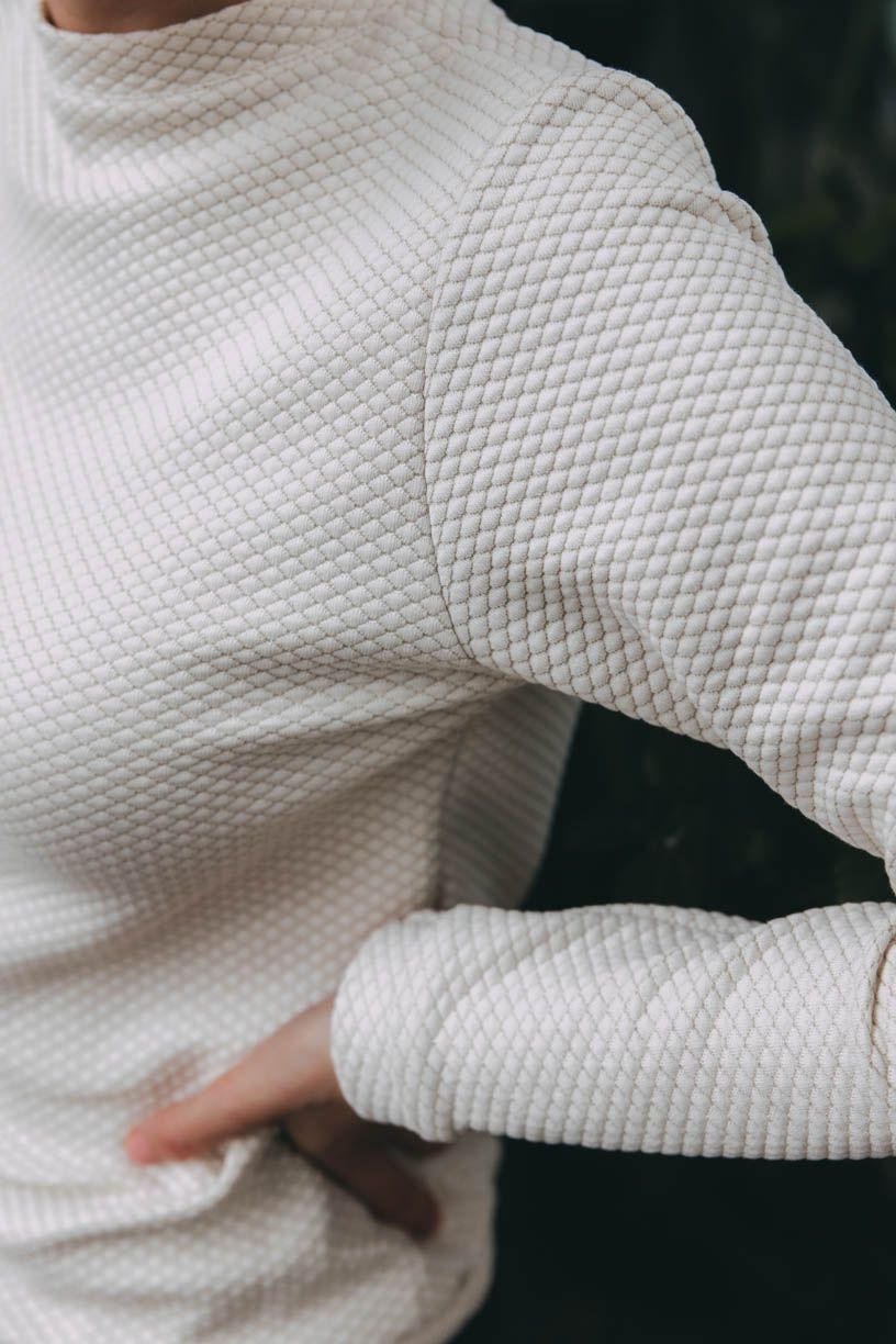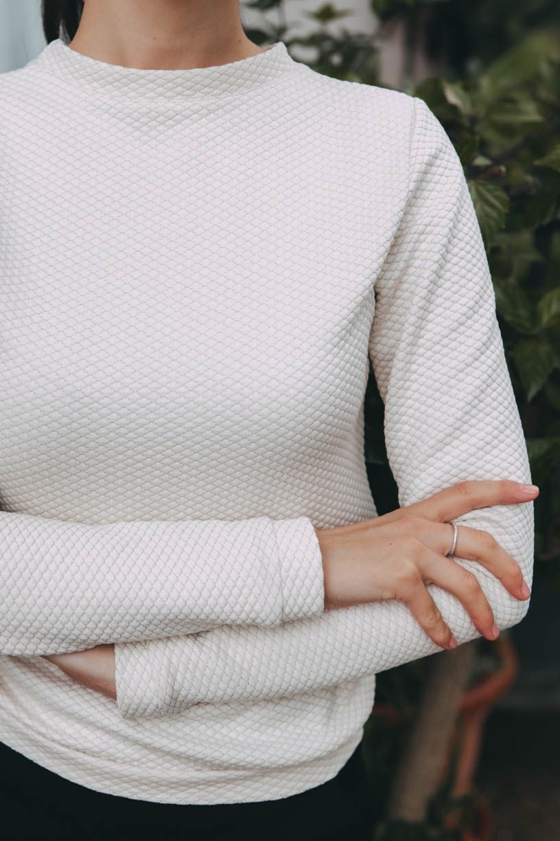 Ne každá mikina musí být široká a oversized. Mchanga obepíná tělo přesně tak, abyste se cítila komfortně, ale zároveň upraveně. Vyšší kulatý límec jí dodává čistý, sofistikovaný vzhled, zatímco náplety v pase a na rukávech udrží tvar i po dlouhých dnech nošení.