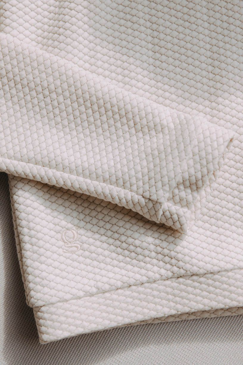 Prémiová směs organické bavlny, polyamidu a metalizovaného polyesteru s kosočtvercovou texturou je příjemná na dotek, prodyšná a odolná. Jemný ecru odstín doplněný zlatavými odlesky v prošívané vazbě se snadno kombinuje a hravě si najde místo i v kapsulovém šatníku.