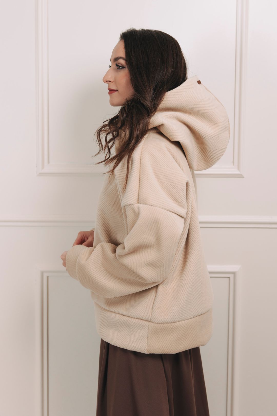 - Stažená pro eleganci: Použijte stahovací šňůrku ve spodní části mikiny, podkasejte ji a vytvořte zkrácený střih. Ten se skvěle hodí k sukni, kalhotám s vyšším pasem a kozačkám – získáte tak nečekaně elegantní outfit vhodný i do kanceláře.