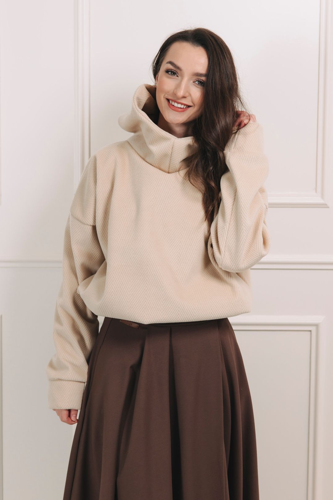 Pro volný, ležérní look: Zvolte svou obvyklou velikost. Mikina je navržena jako spíše větší (oversized), takže i vaše standardní velikost bude krásně volná a skvěle se hodí k legínám či úzkým kalhotám.