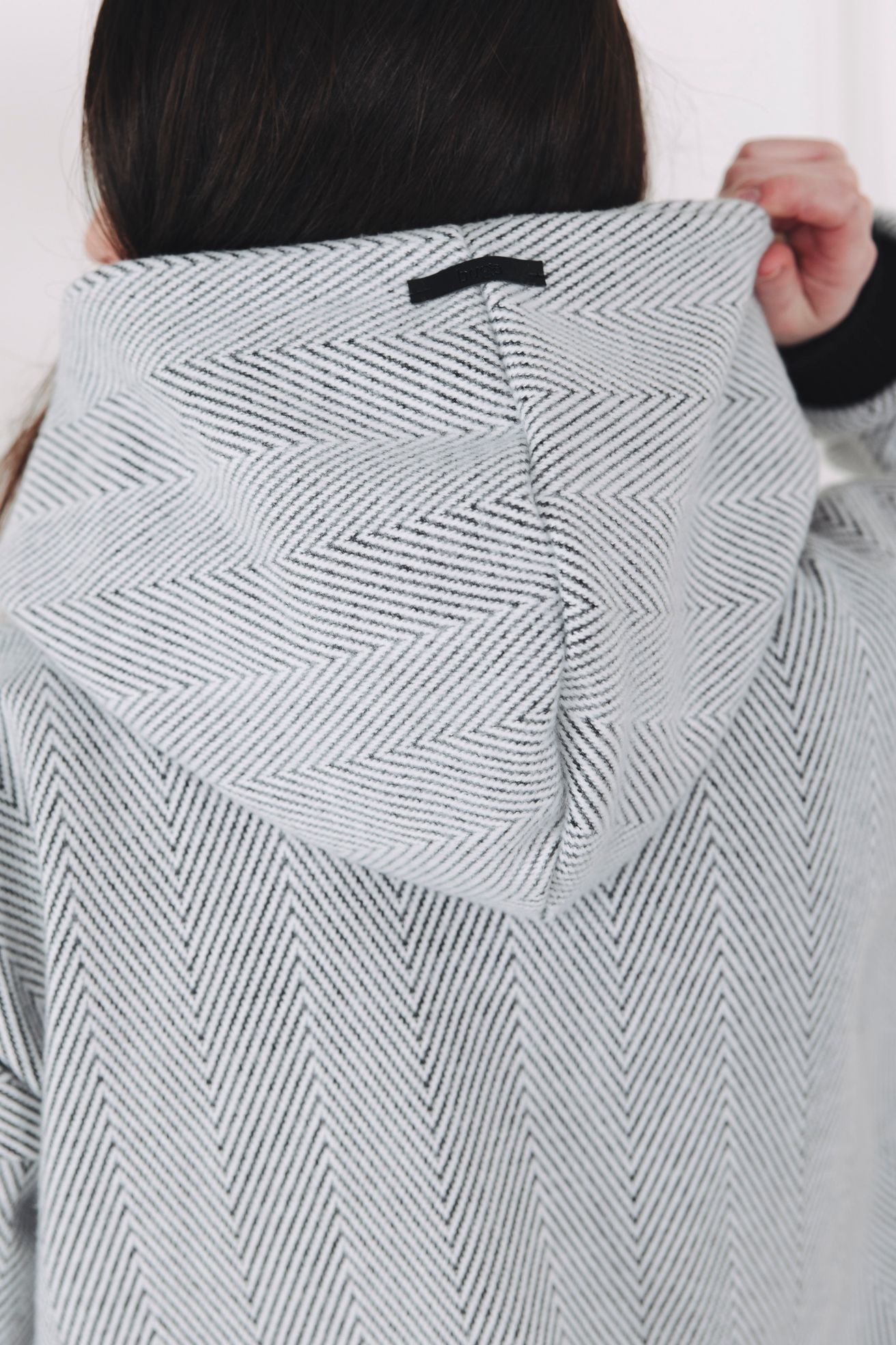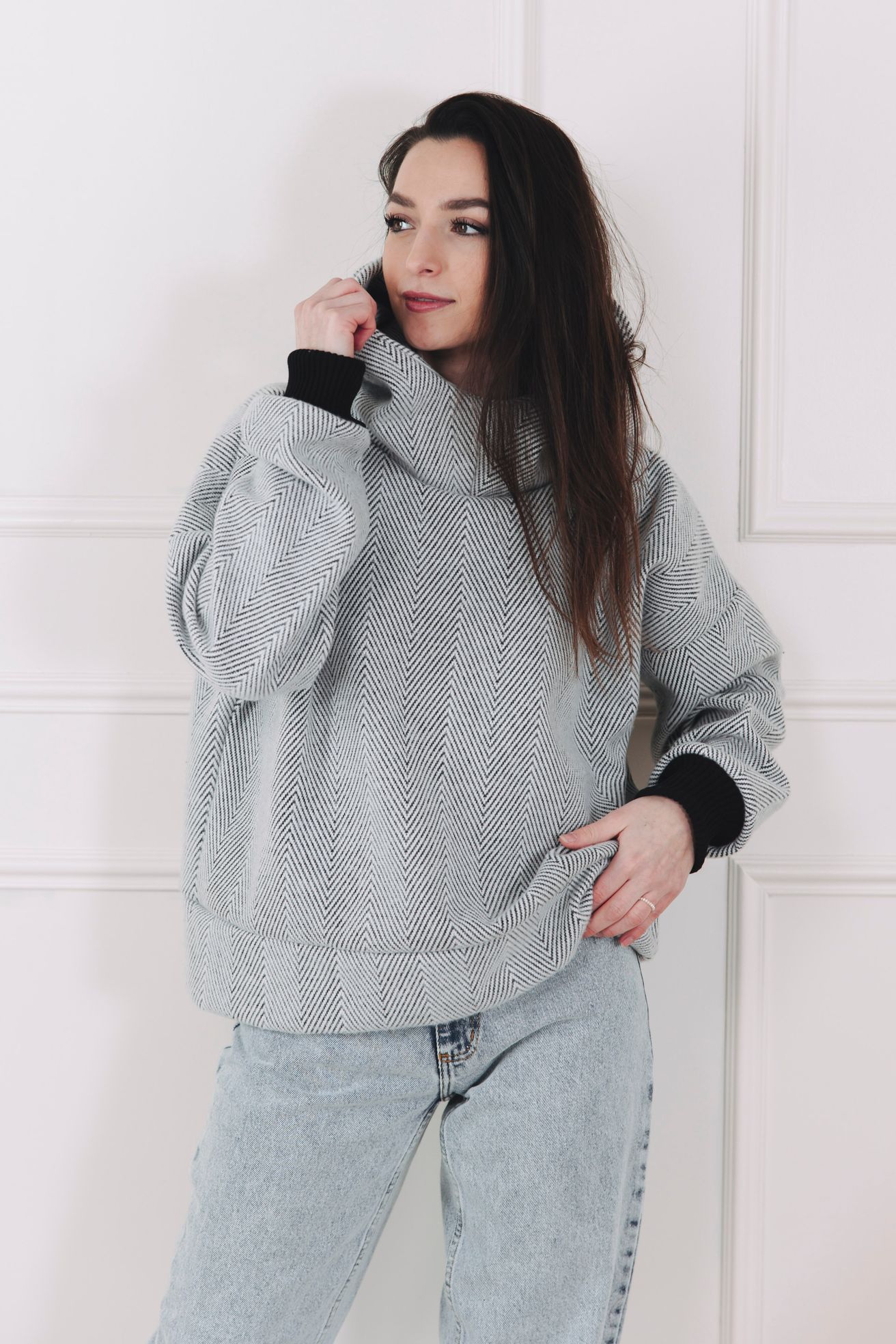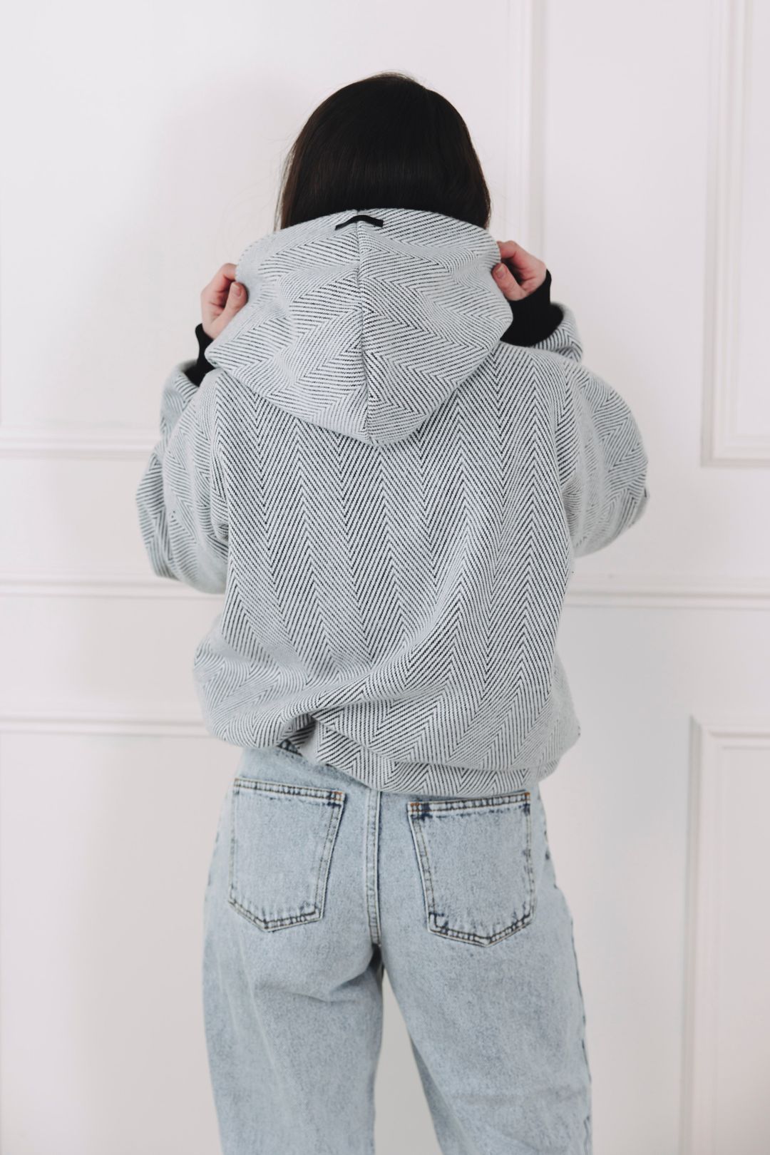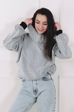 - Barva a vzor: Kombinace světle šedé a celoplošný, výrazný vzor rybí kosti (chevron), který vytváří jemný klikatý efekt po celé ploše. Volnější oversized střih doplňují výrazné žebrované manžety odstínu, které barevně navazují na tmavší nit ve vzoru a dodávají mikině moderní, monochromatický charakter.