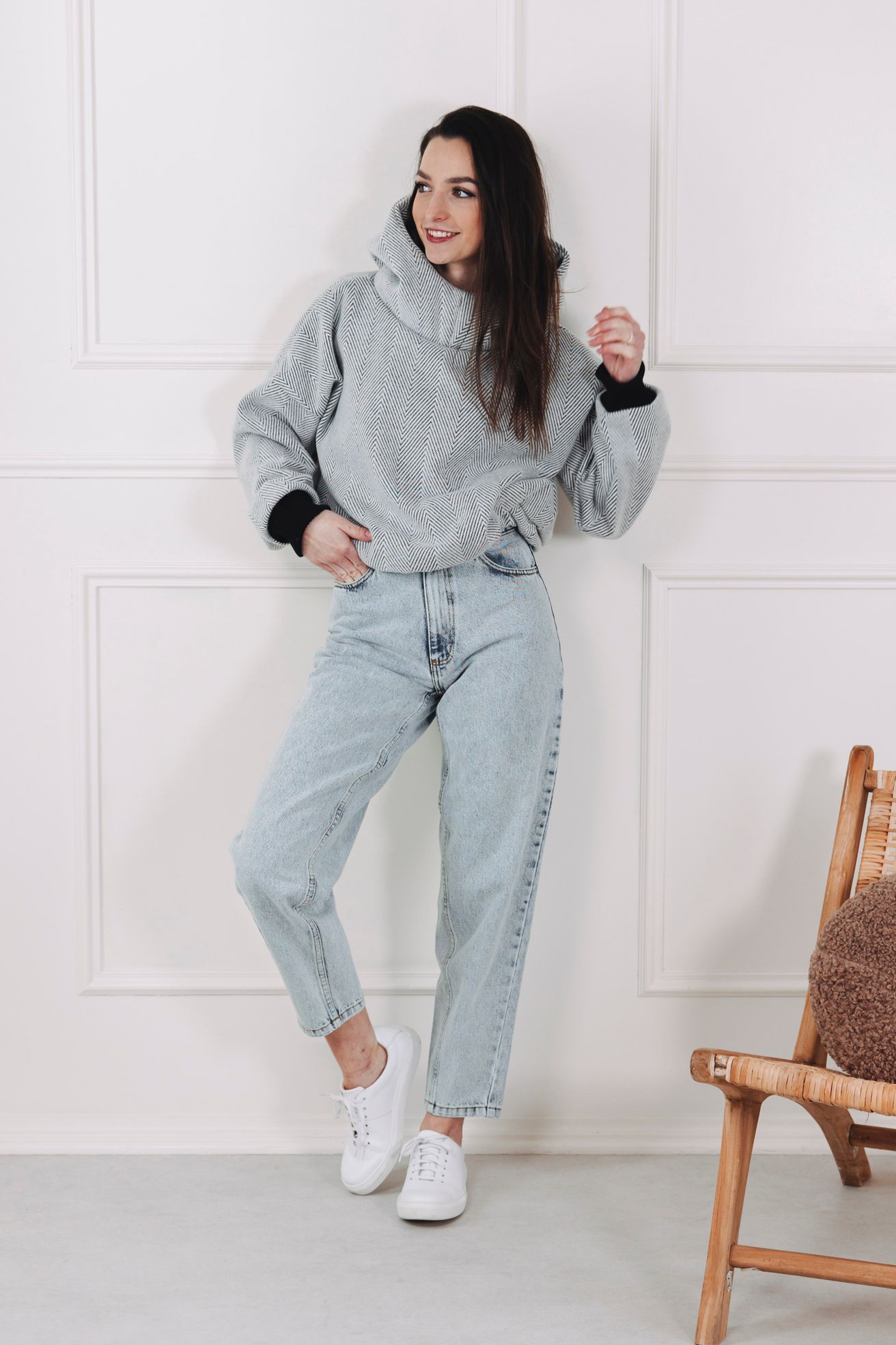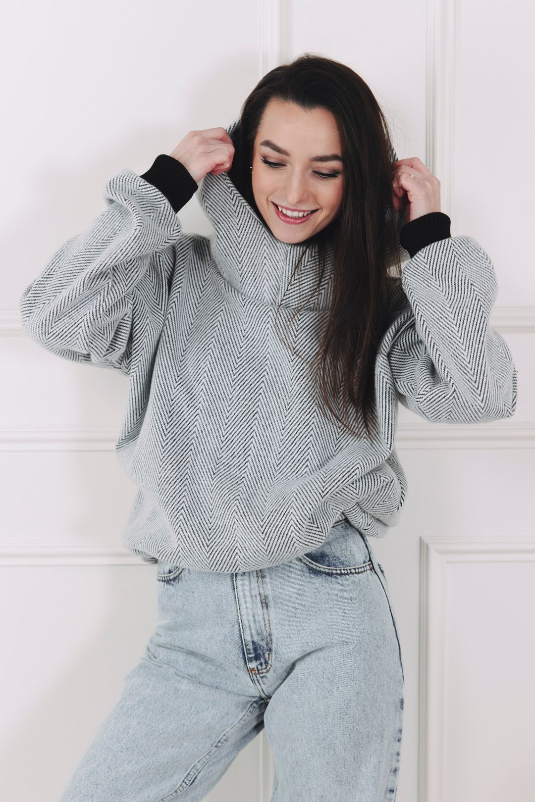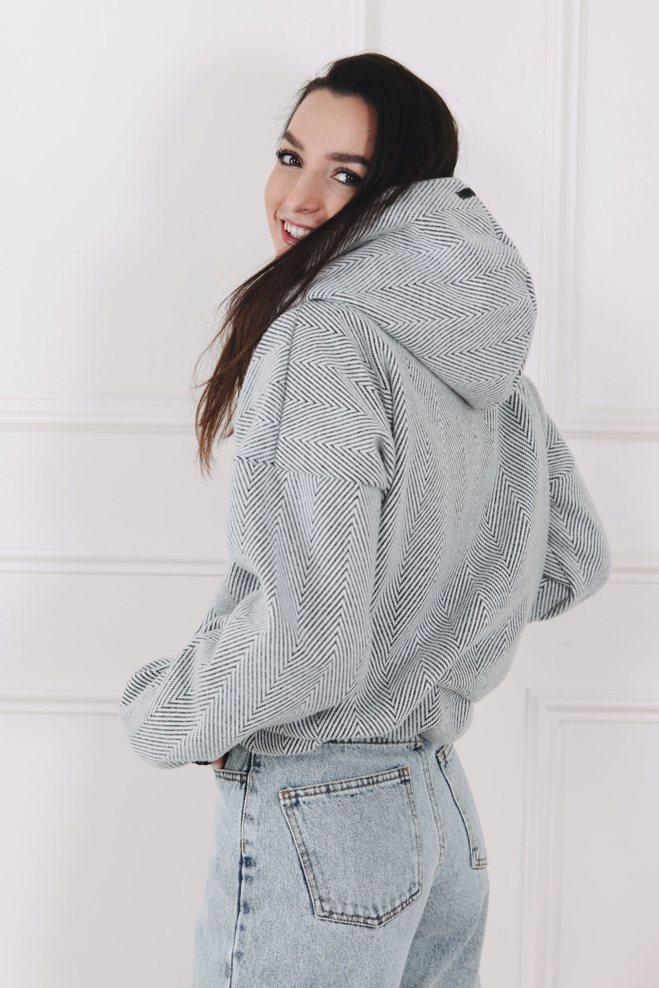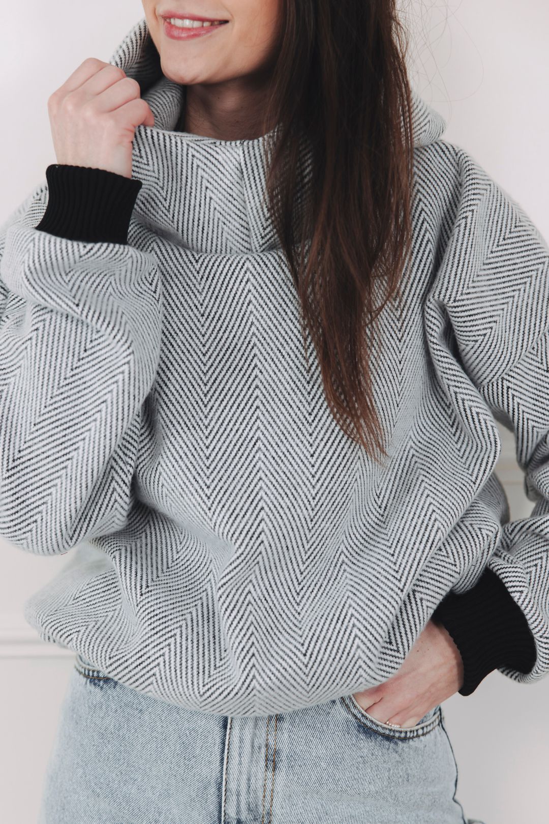 - Barva a vzor: Kombinace světle šedé a celoplošný, výrazný vzor rybí kosti (chevron), který vytváří jemný klikatý efekt po celé ploše. Volnější oversized střih doplňují výrazné žebrované manžety odstínu, které barevně navazují na tmavší nit ve vzoru a dodávají mikině moderní, monochromatický charakter.