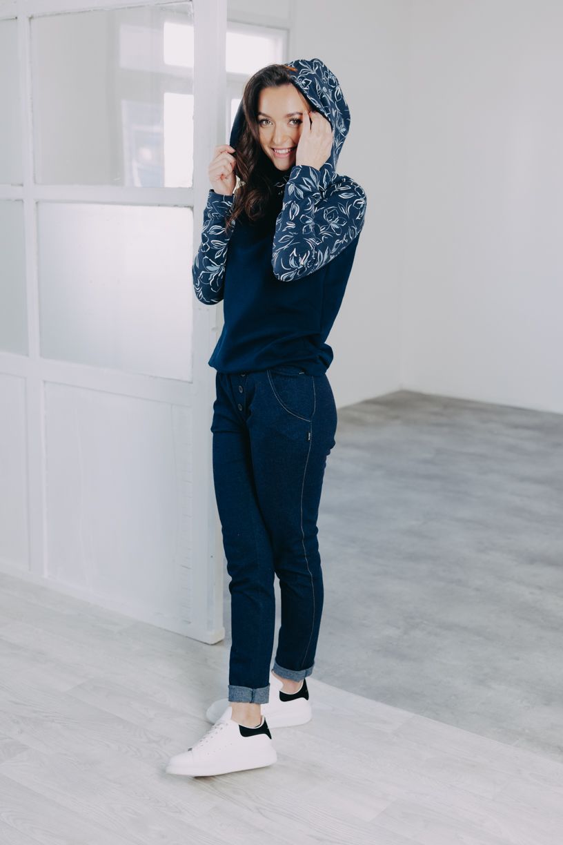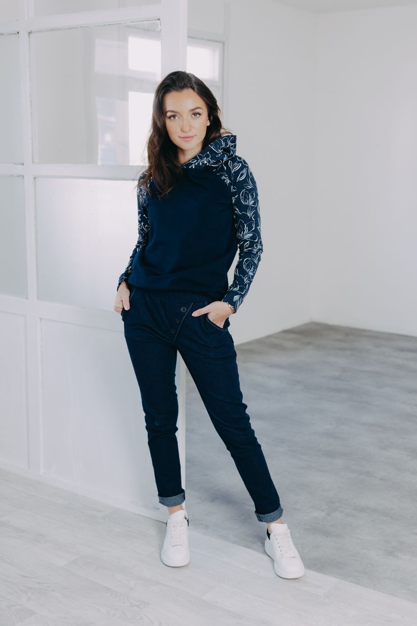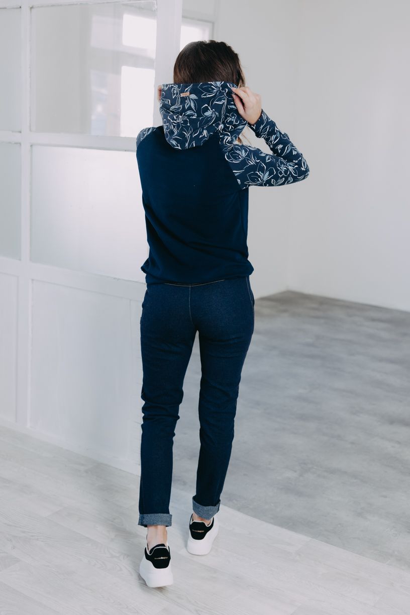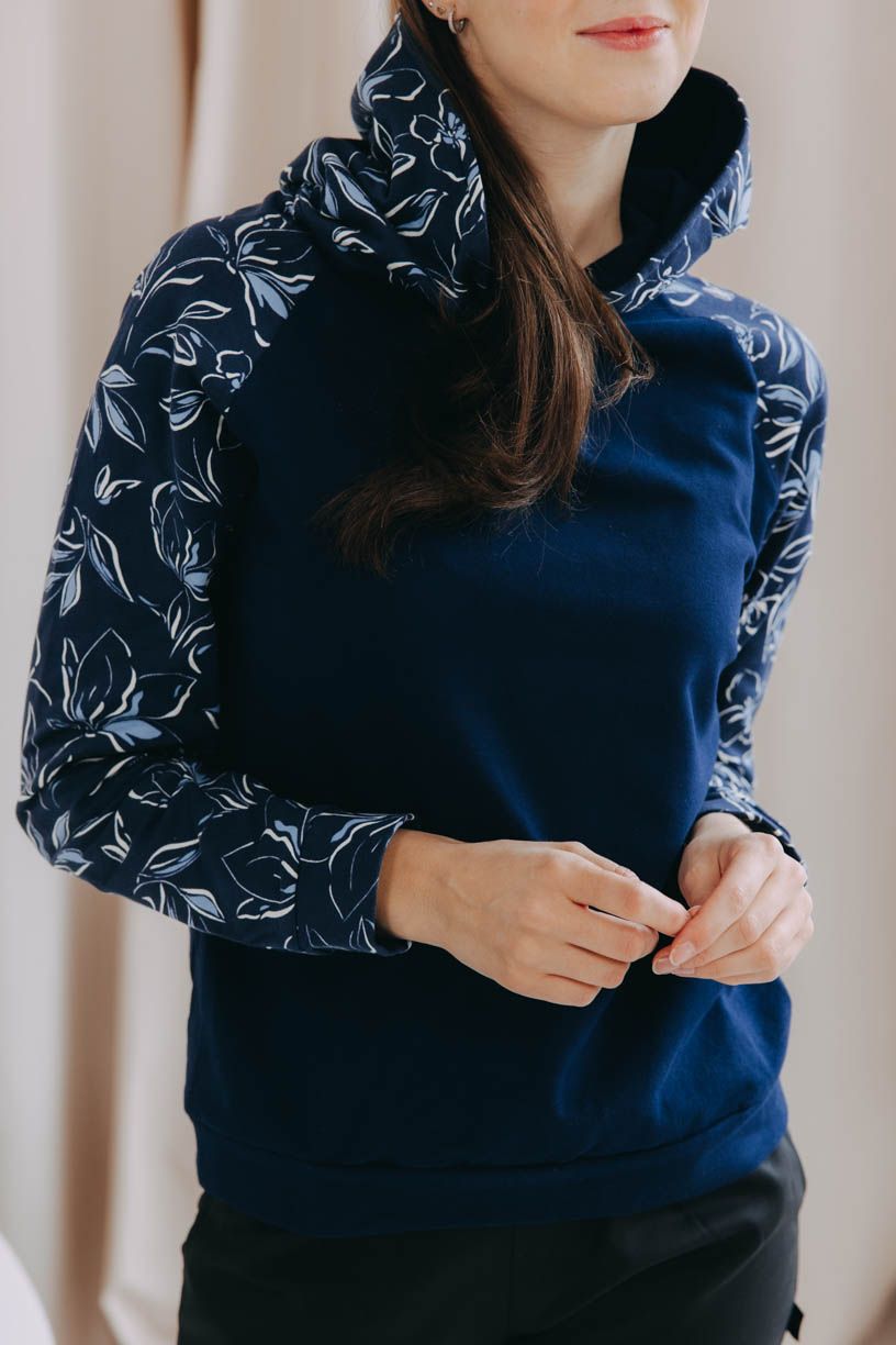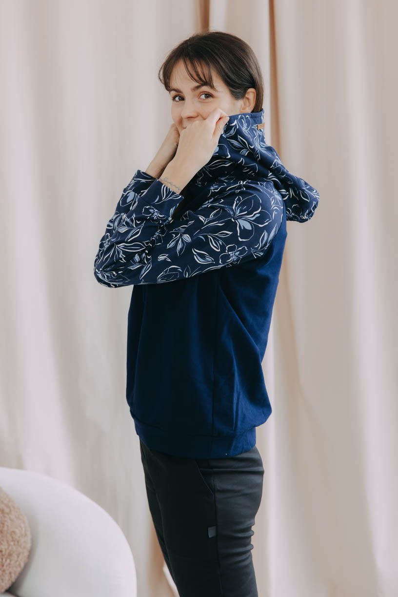 Poznávacím znamením č. 1 mikiny Wazi Navy jsou barevné raglánové rukávy a hluboká kapuce ve stejném vzoru. O co jsou její detaily výraznější, o to je jednodušší jako celek – však jednoduchost a volnost jsou stejně jako příjemná bavlna s elastanem osvědčené kombo, kterým si rády zpříjemníme nejen večerní gaučování, no ne?