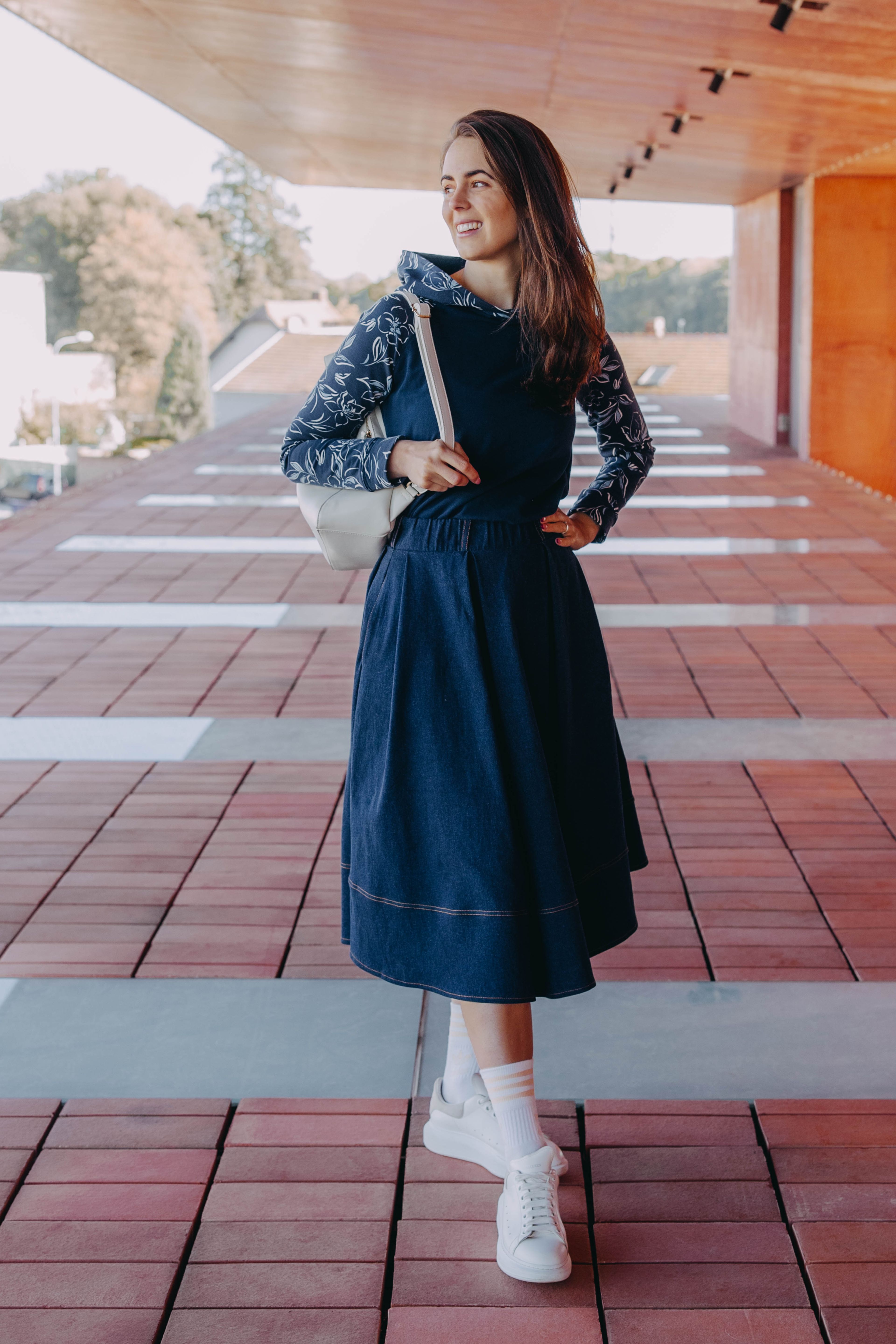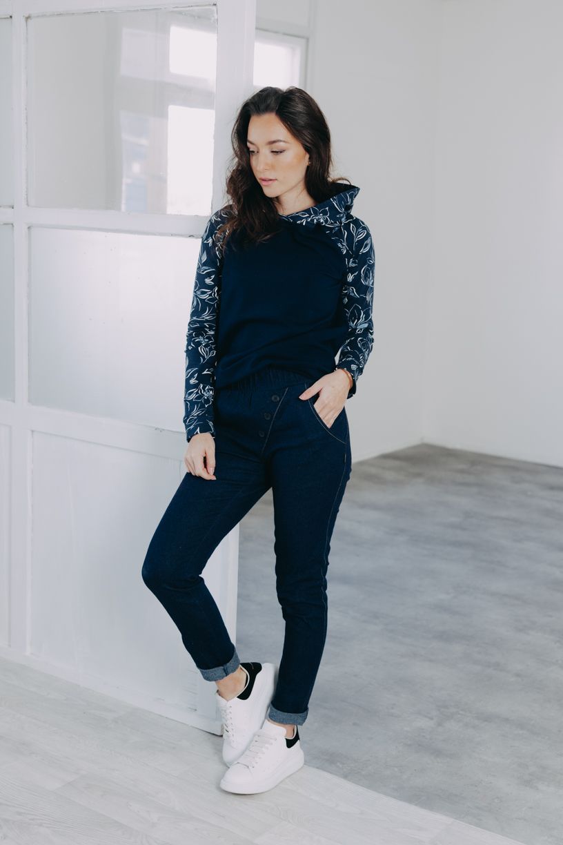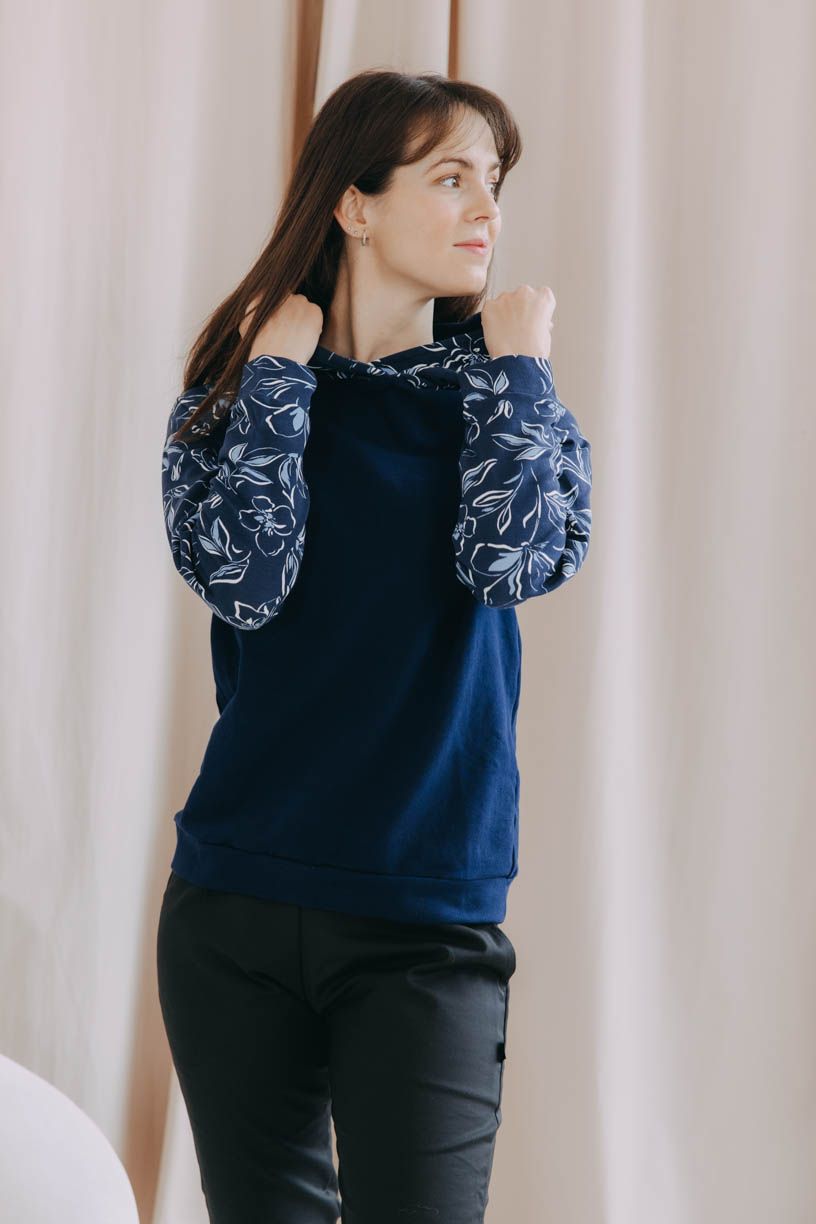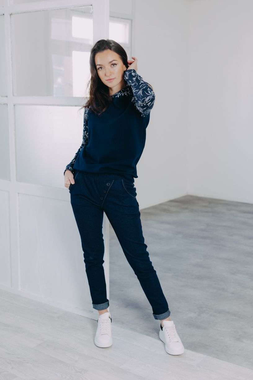 Poznávacím znamením č. 1 mikiny Wazi Navy jsou barevné raglánové rukávy a hluboká kapuce ve stejném vzoru. O co jsou její detaily výraznější, o to je jednodušší jako celek – však jednoduchost a volnost jsou stejně jako příjemná bavlna s elastanem osvědčené kombo, kterým si rády zpříjemníme nejen večerní gaučování, no ne?