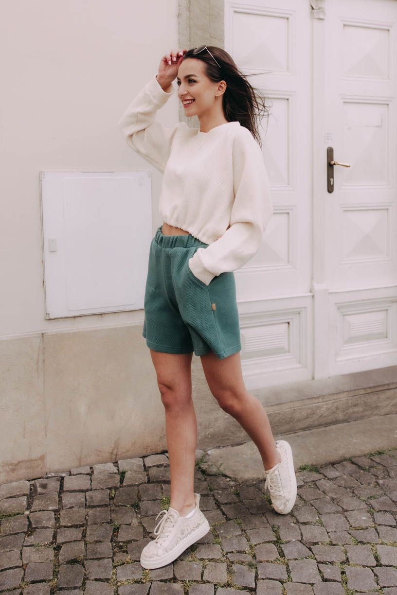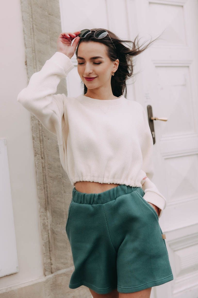 Chcete-li trefit dvě mouchy jednou ranou a mít postaráno o celý outfit, ušili jsme k ní i pohodlné kraťasy ze stejného materiálu ve dvou odstínech, které můžete barevně sladit Kraťasy Zena Ecru, nebo barvy zkombinovat Kraťasy Zena Olive.