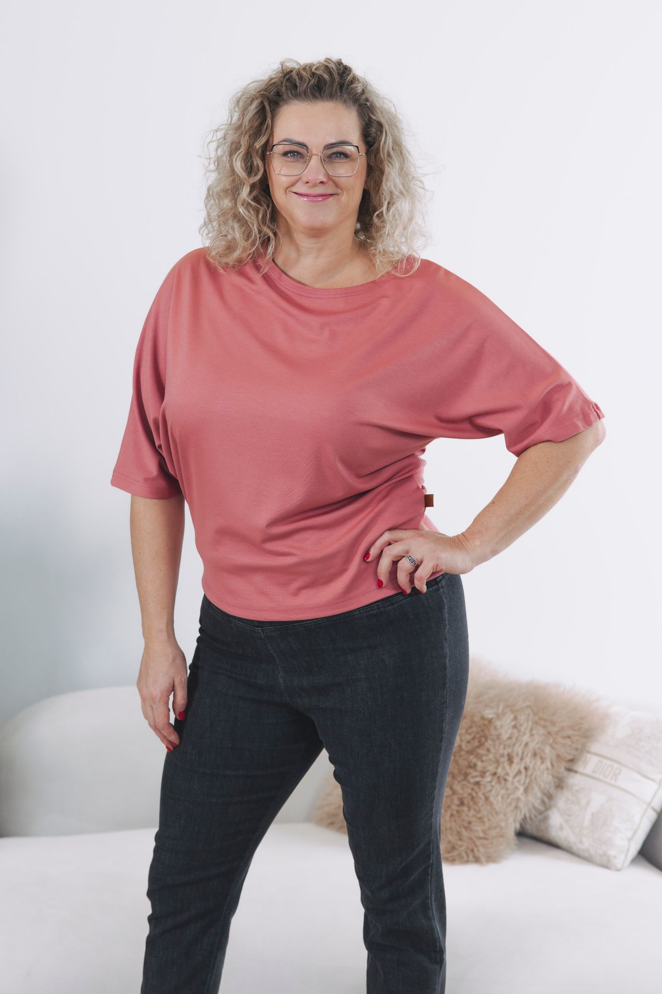 - Top jako základ: Zvolte zajímavý top. Ať už s V-výstřihem (Bakari) nebo volnější se stojáčkem (Ima Elegance), který jen částečně zastrčíte do pasu pro zdůraznění linie.