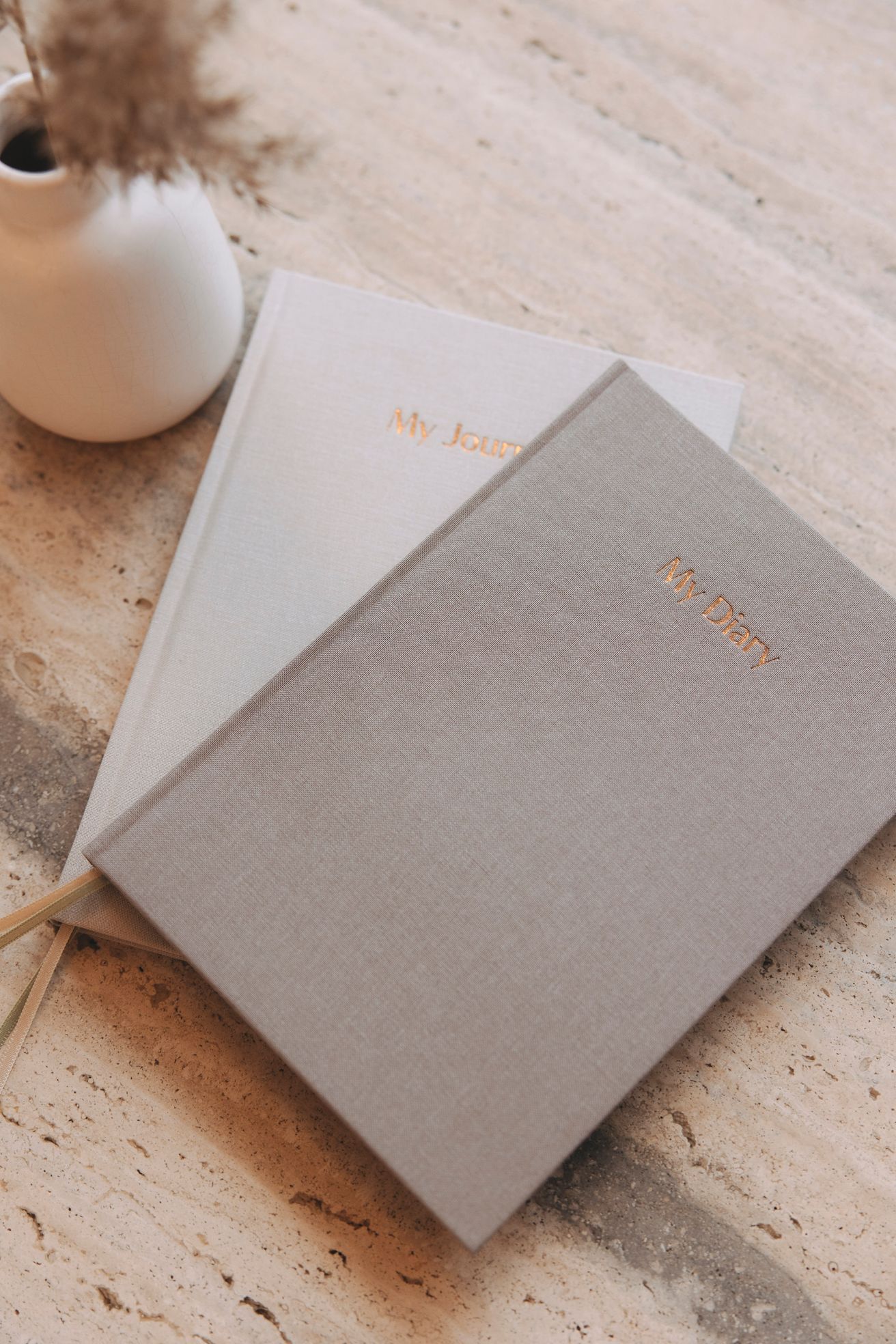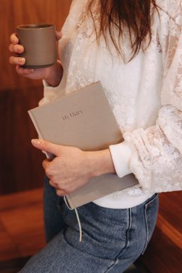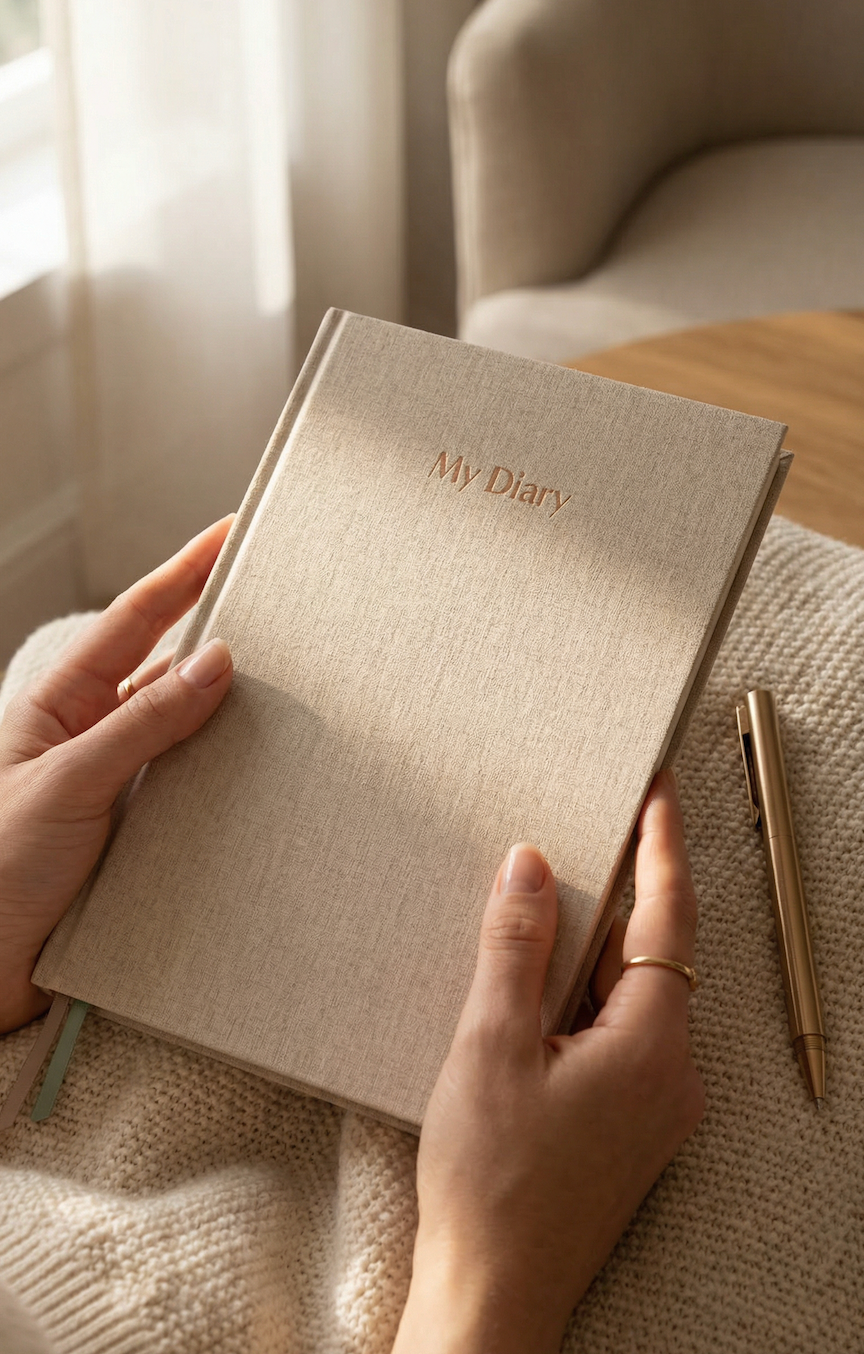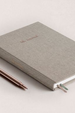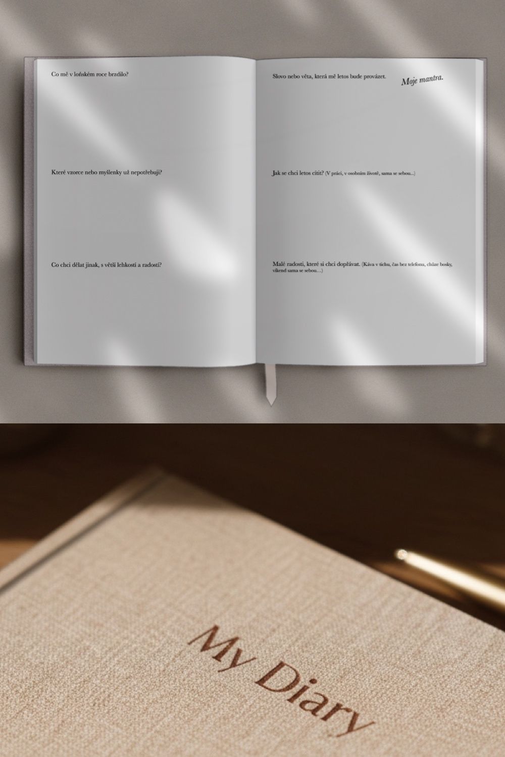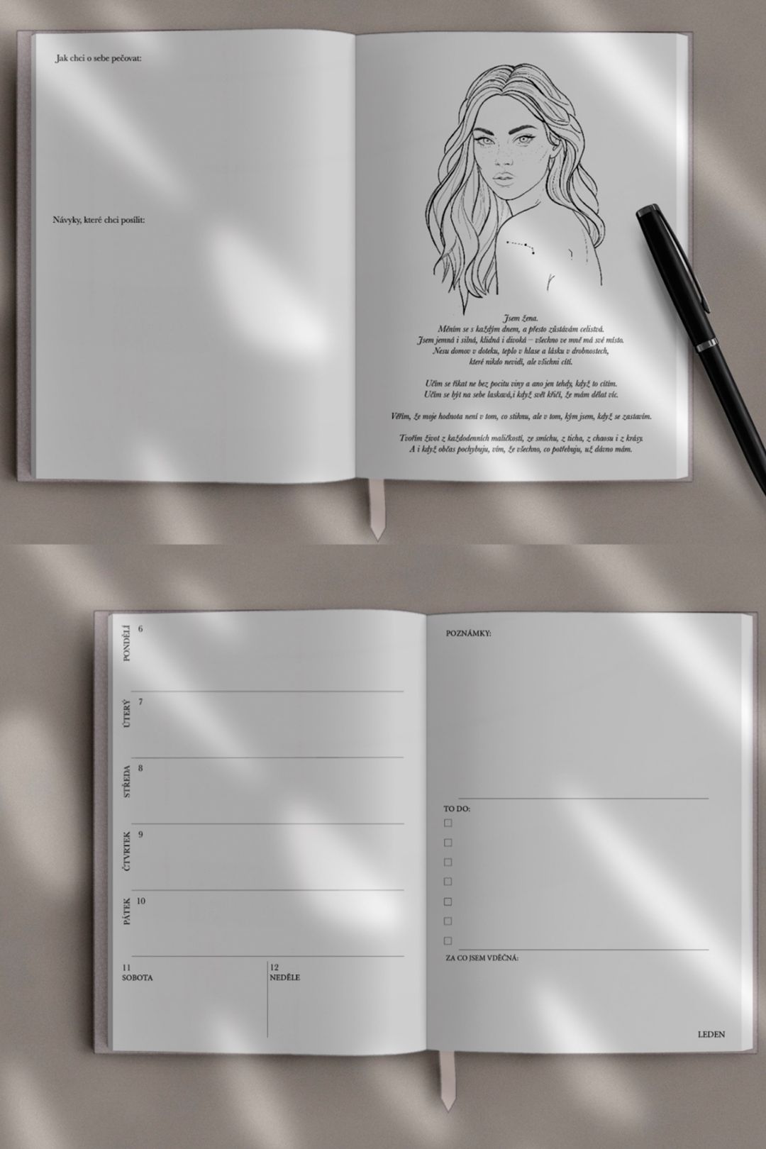 Diář s lněným obalem a bronzovou ražbou – místo pro plány, sny a ženskou energii.
