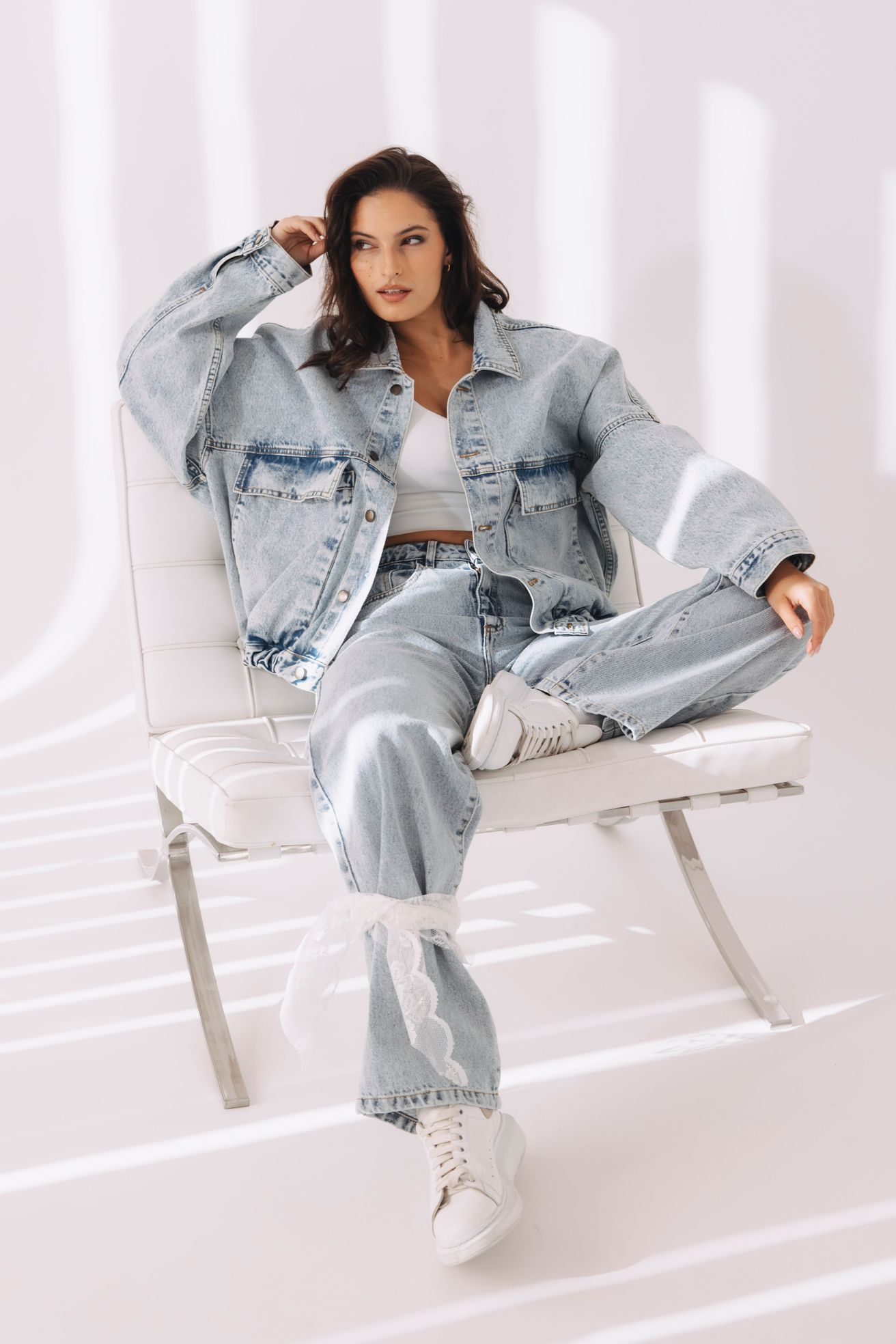 Jak na to: Můžete jít dvěma cestami. Buď zvolte monochromatický look a vsadíte na téměř totožné odstíny denimu na kalhotách i horním díle. Nebo naopak vytvořte kontrast – ke světlejším džínům přidejte výrazně tmavší džínovou košili či oversized bundu.