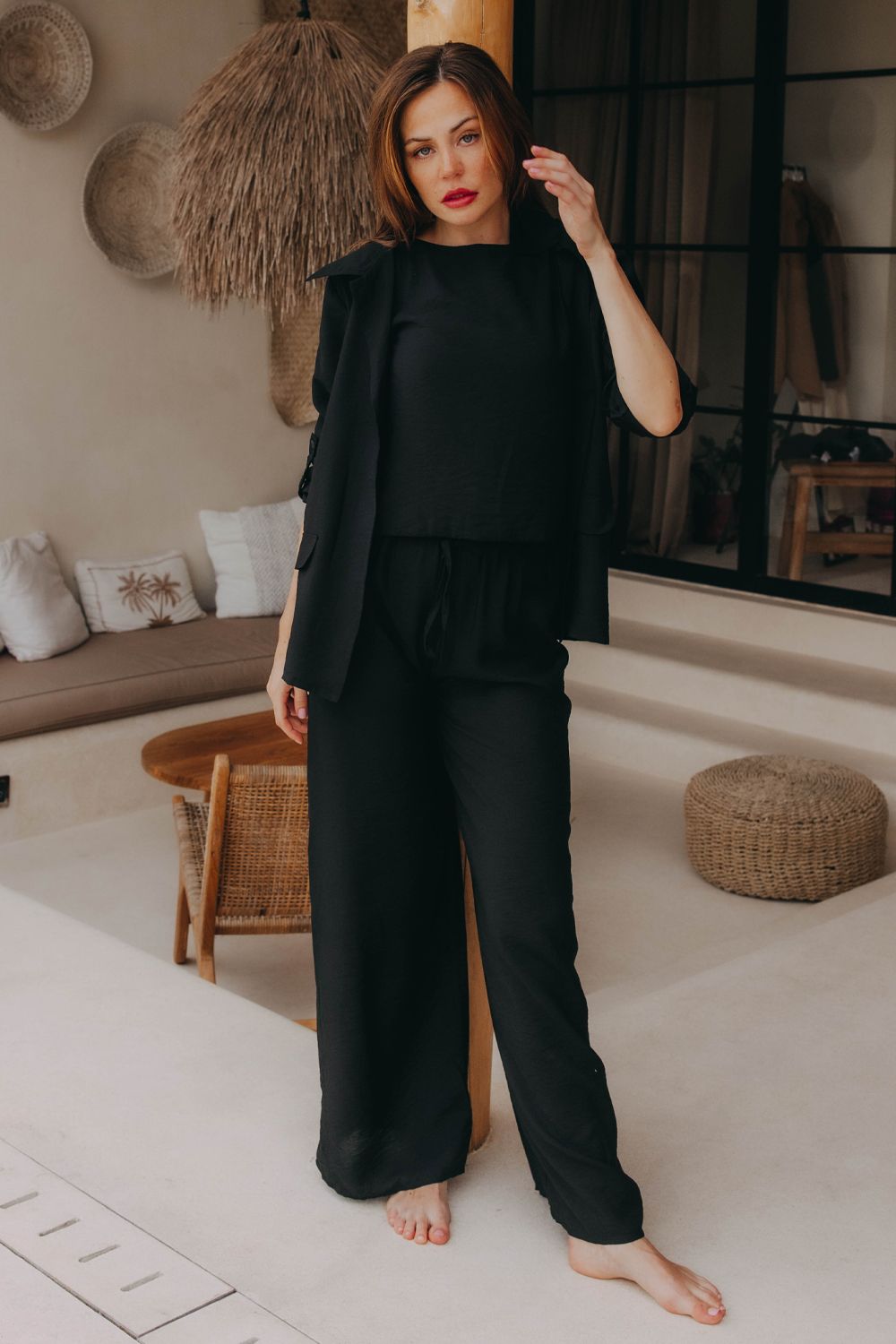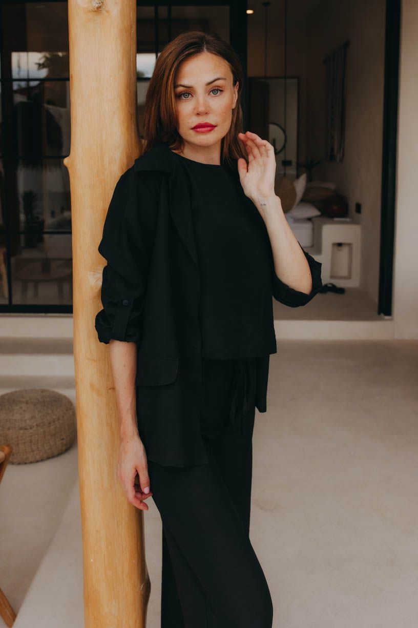 Pro milovnice černé barvy, které znají cenu elegance a stylu a nehodlají se vzdát svého milovaného černého ani v letních měsících. Outfit All Black Lady je jako záblesk nočního nebe, který vás okouzlí svou lehoučkou látkou a sofistikovanými detaily. Svěží střih topu Putu Indira s elegantním detailem na zádech dodá vašemu vzhledu ten správný nádech luxusu. Díky lehkému materiálu, ze kterého jsou kalhoty Putu Guru i sáčko Putu Bimal ušité, nebude v kostýmku takové teplo, což ho činí ideální volbou pro horké letní dny, kdy chcete vypadat elegantně a zároveň se cítit pohodlně.