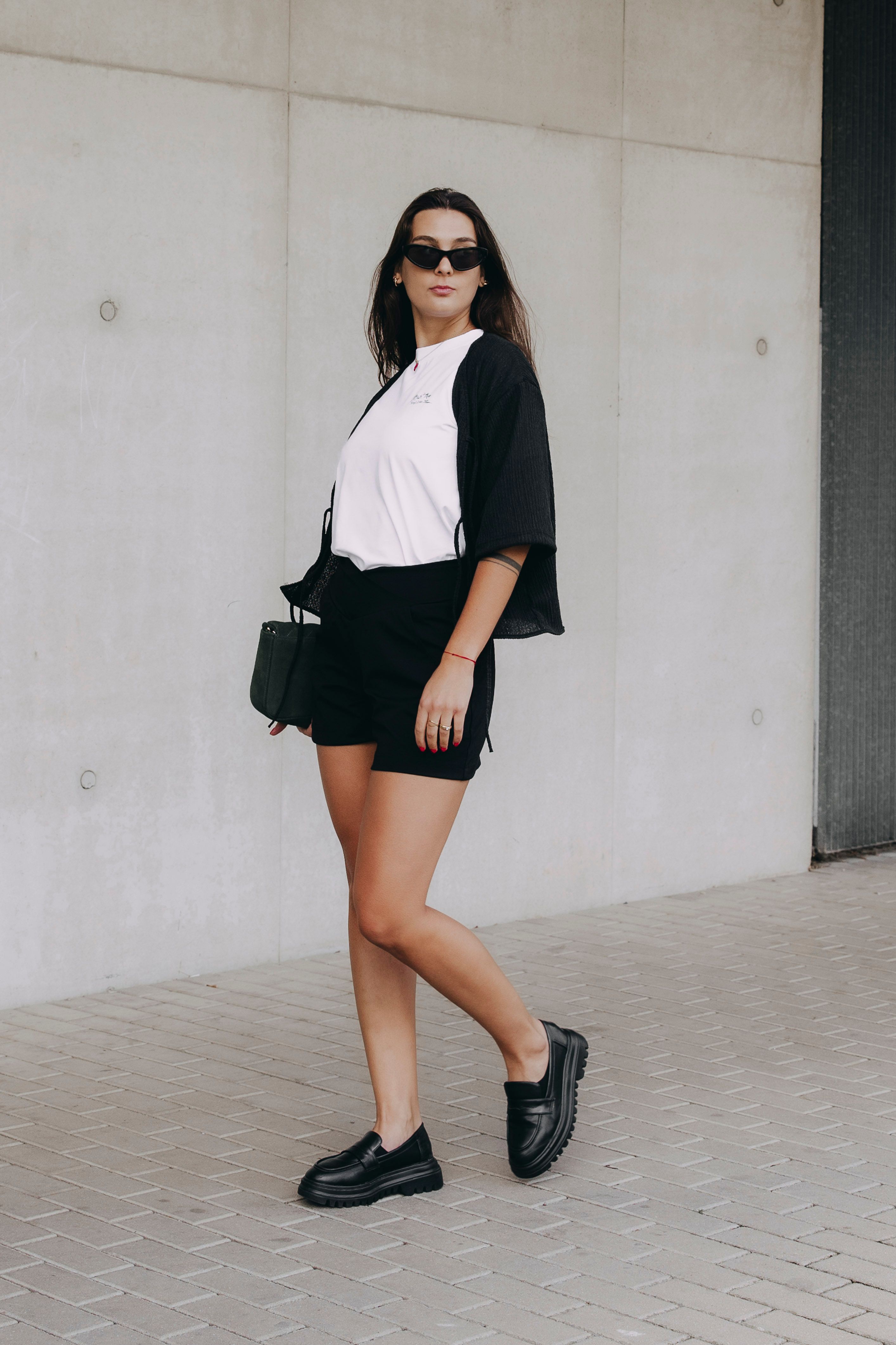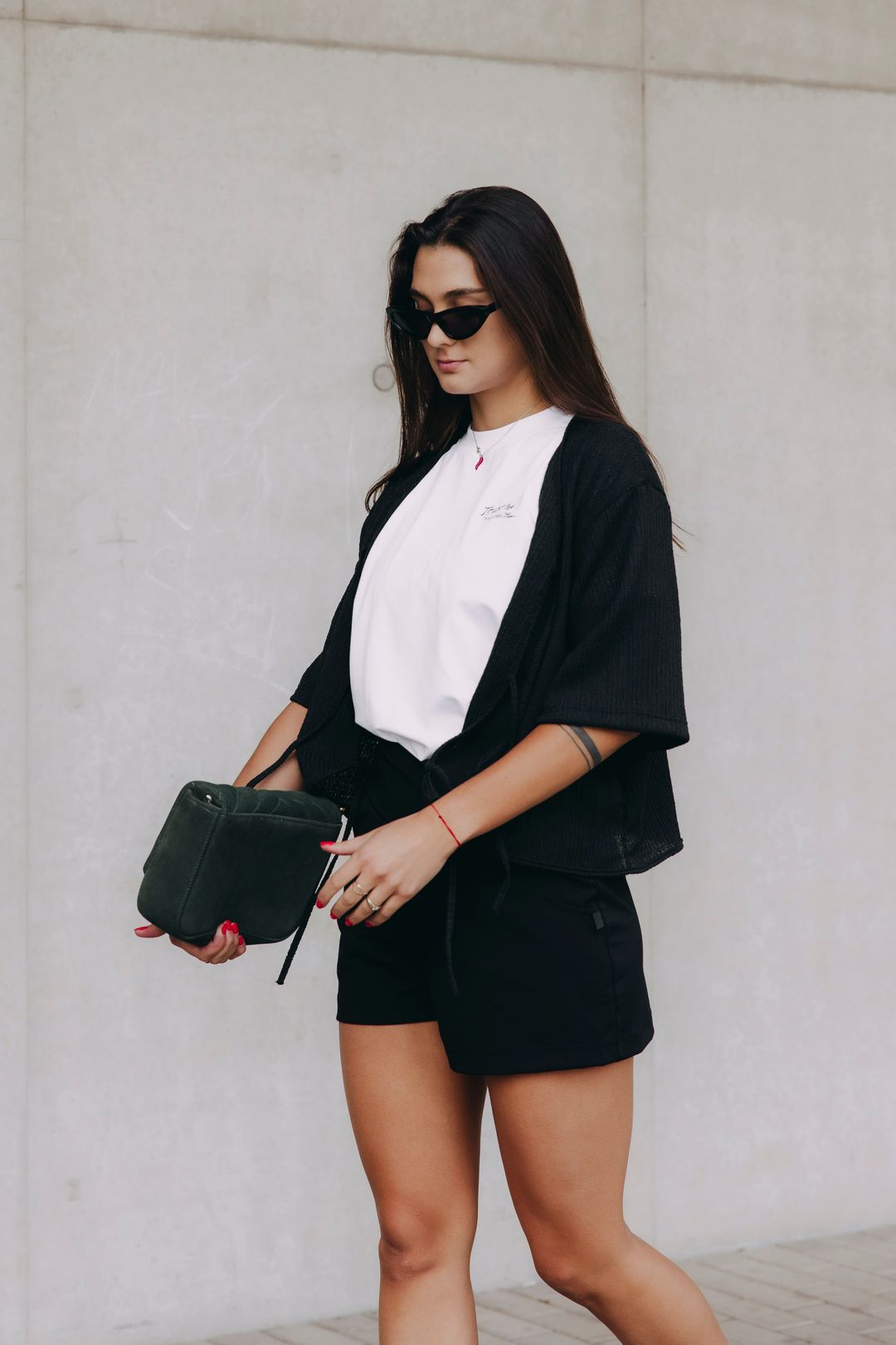 Ne vždy je třeba dramatický look, abyste zanechali dojem. Někdy stačí, když se cítíte silná, sebevědomá a ve svém tempu. A přesně takové jsou i tyto kousky - jednoduché, ale s výpovědní hodnotou. Základem outfitu jsou černé kraťasy Selas Summer, které nepůsobí ani moc sportovně, ale nejsou ani strojené. Drží tvar, nechají vám prostor a budete se v nich cítit dobře i po několika hodinách venku. Bílé triko We All Grow z kolekce Mood je čisté, hladké, s výrazným nápisem na zádech, který řekne víc, než byste čekali. Funguje jako kontrast, ale také jako odlehčení celé siluety. Přehozený top Kamau v černé vytváří dojem vrstvení, ale bez zbytečného komplikování. Je to ten typ vrchního dílu, po kterém sáhnete tehdy, když chcete ještě něco, ale nevíte přesně co.