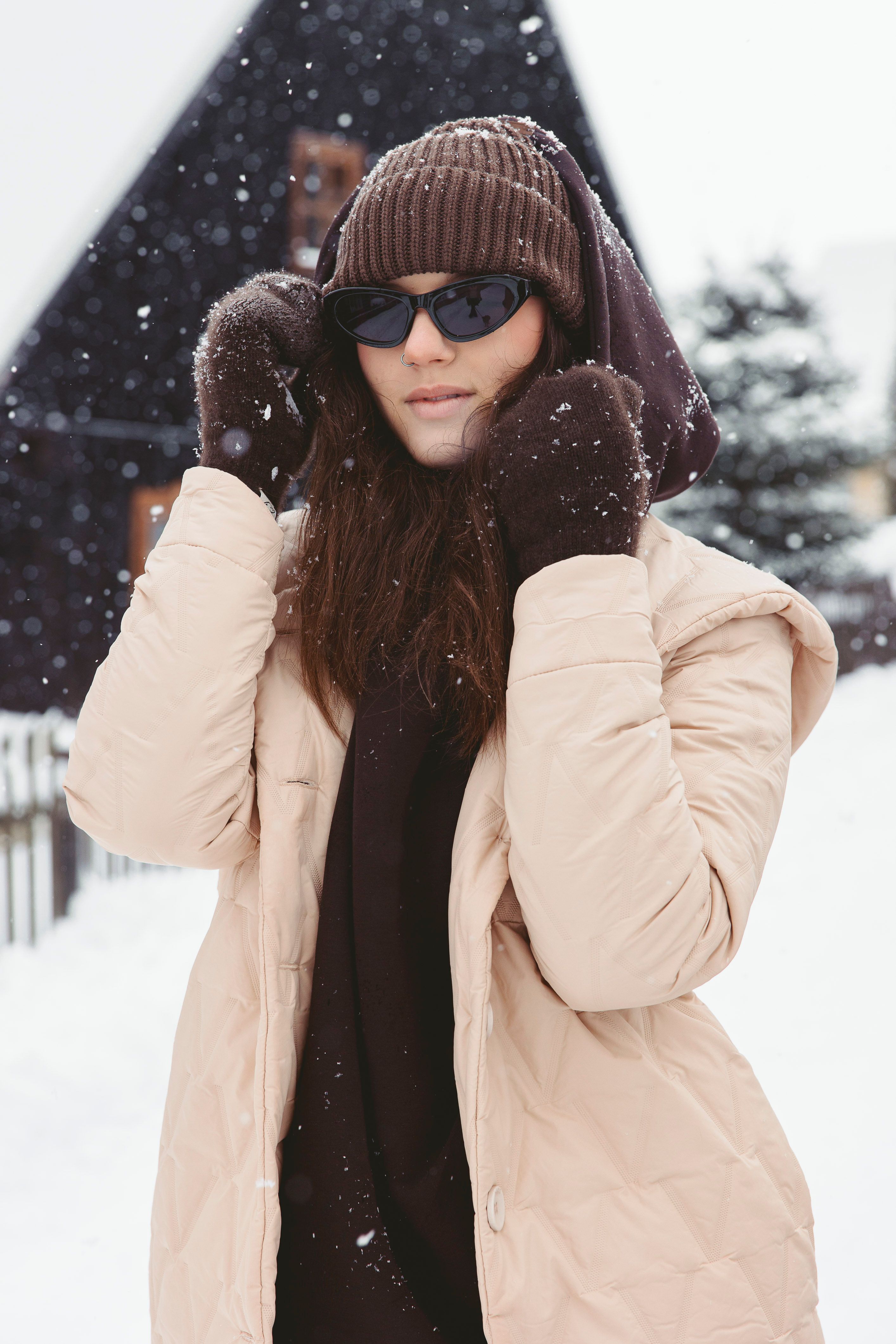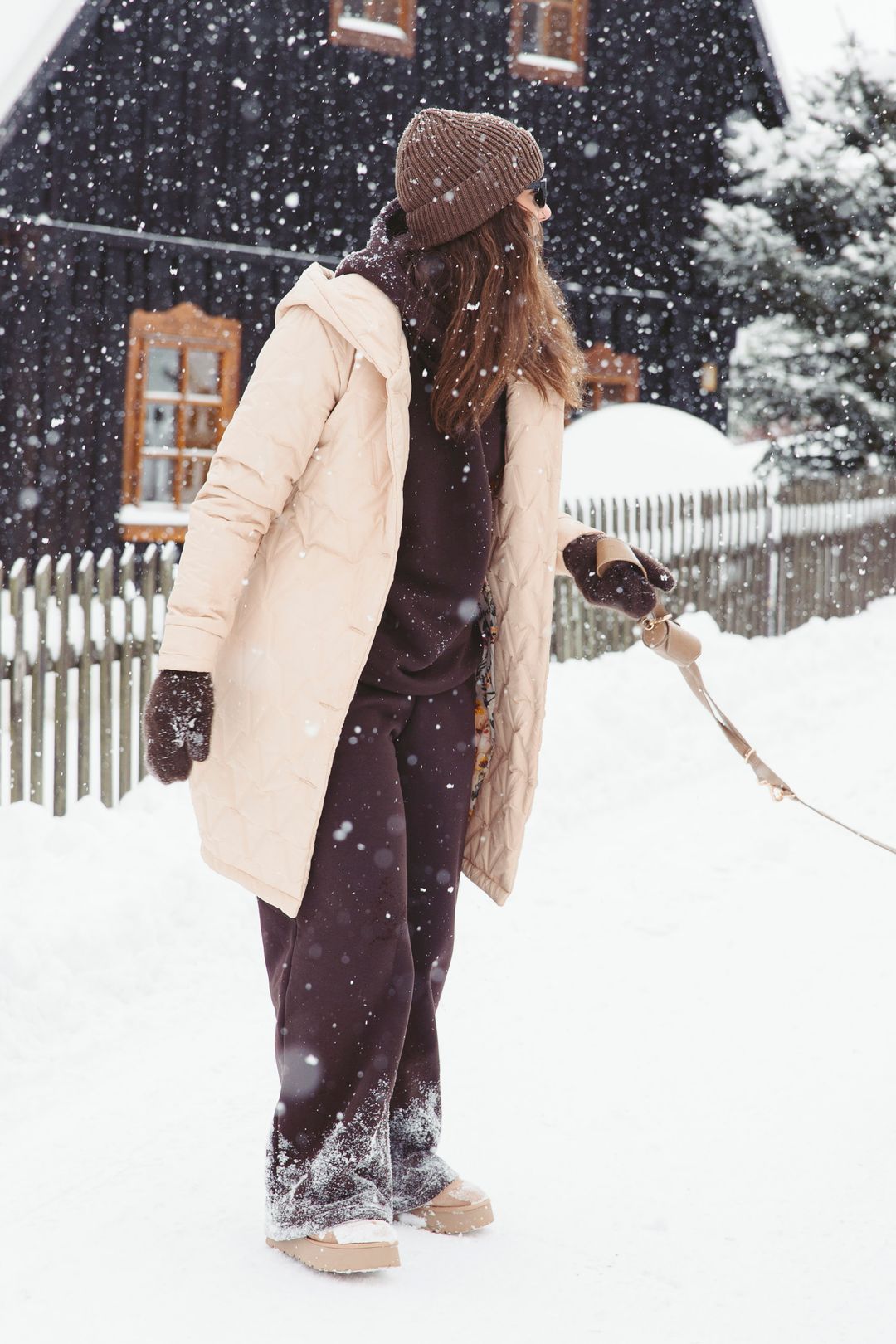 Světlé barvy v zimě působí neuvěřitelně svěže. Základem je naše ikonická teplákovka Hawa, kterou jsme povýšili na elegantní úroveň díky kabátu Lawali. Tenhle look doplňuje hnědá merino čepice, která rozbíjí světlý monolit. Je to ideální outfit na víkendový brunch v horách nebo stylovou procházku městem, když vločky začnou tancovat kolem.