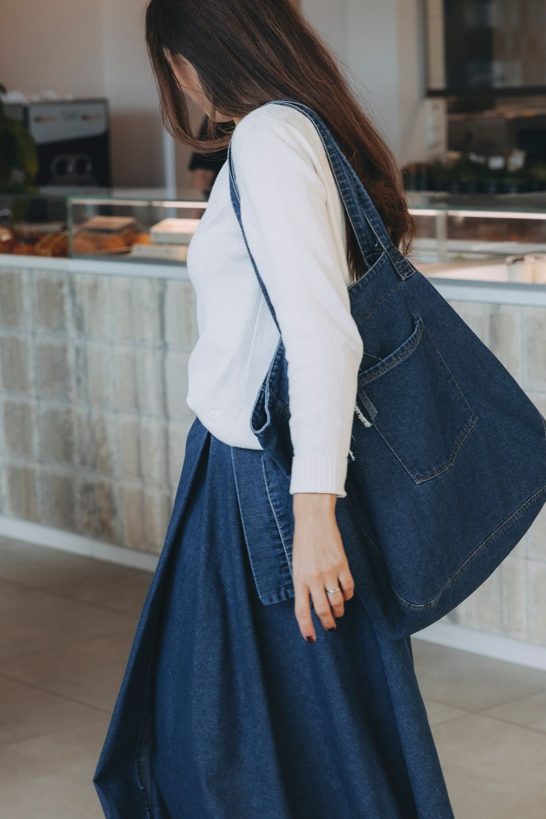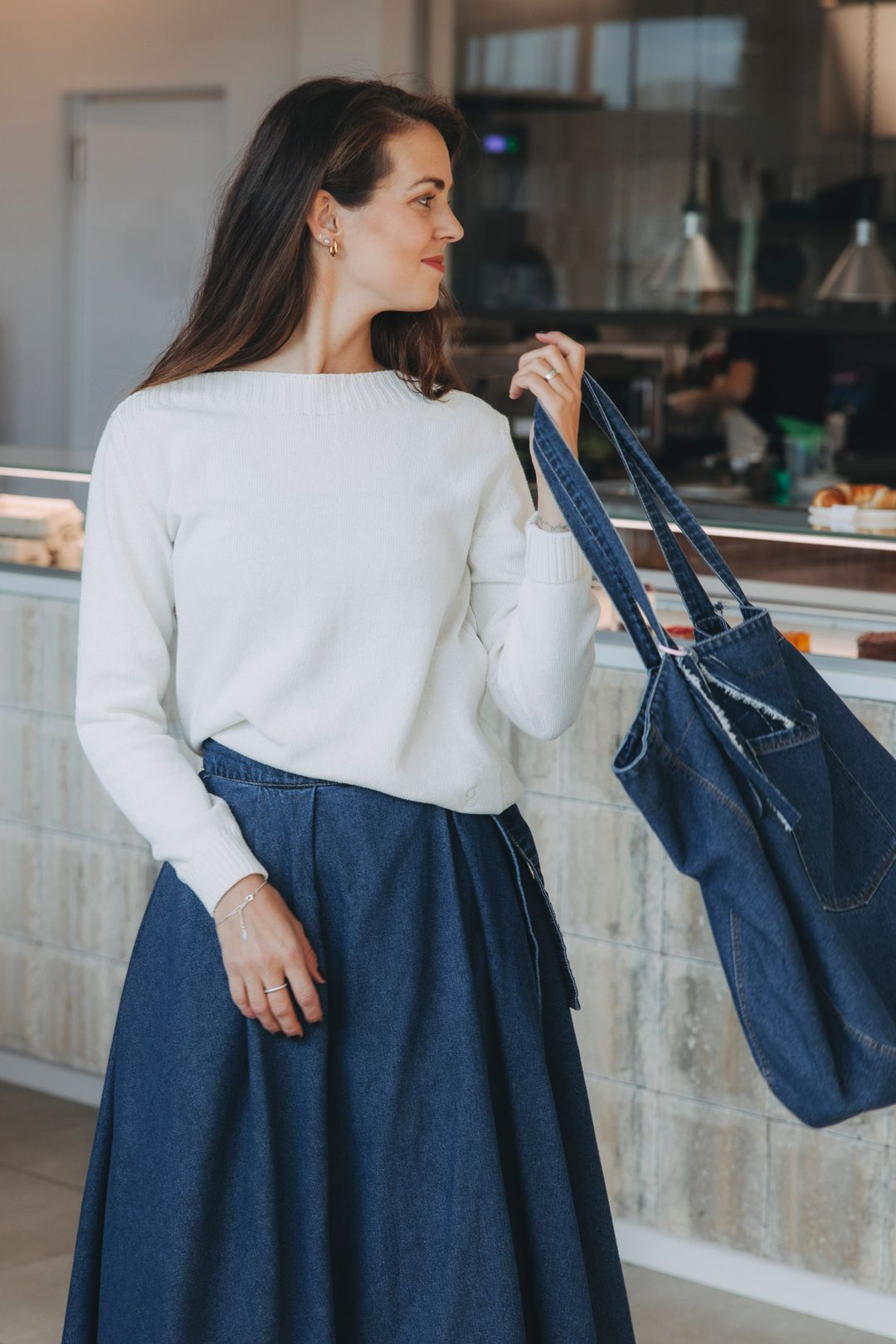 Někdy je to o jednoduchosti, která má duši. Sukně Mawe – naše bestsellerová láska, tentokrát v denimovém provedení – jako základ, který zná svou sílu. K tomu svetřík s lodičkovým výstřihem, jemný a nenápadně ženský, a taška v denim provedení, co celý look ukotví a přidá mu ležérní tón.
