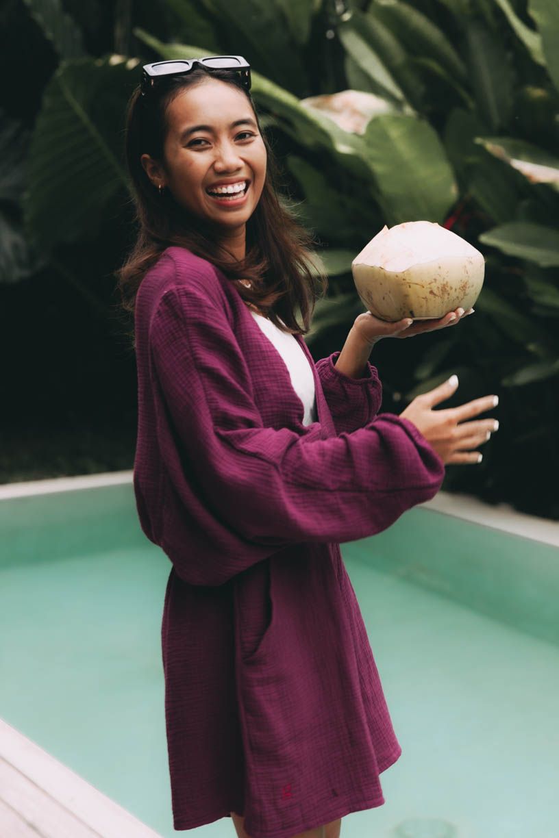 Look pro všechny momenty, kdy se prostě cítíte ve své kůži – a chcete, aby to bylo i trochu vidět. Pohodlně, sebevědomě, v barvě, která si jde svou cestou, ale zároveň vám nechává prostor volně dýchat. Kraťasy Akosua v bordó odstínu působí odvážně – mají v sobě měkkost mušelínu i charakter, a díky volnému střihu a jemnému materiálu sedí tak dobře, že si na ně během dne ani nevzpomenete. Přiléhavý top Laima Ecru je jednoduchý, světlý a čistý jako ráno, které začíná bez budíku. A nakonec top Atai ve stejném bordó tónu. Volně uvázaný, s rozevlátými rukávy, tvoří poslední vrstvu – tu, která z outfitu dělá víc než jen „pohodlný“. Dělá ho zajímavým.