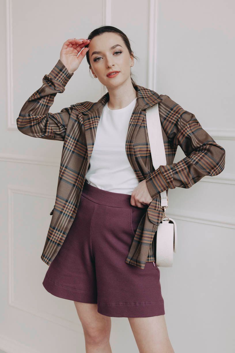 Outfit jako dobře namíchaný drink – vrstvy chutí, které se k sobě hodí lépe, než možná čekáte. Kraťasy Amondi Blueberry jsou jako základní tón koktejlu: pevný, plný charakteru, ale ne dominantní. Jejich decentní textura připomíná jemné bublinky, které v pozadí drží celý zážitek pohromadě. Jednoduché a čisté linie trička Vaipřidávají svěžest, která rozjasní každý doušek (nebo v tomto případě pohled). A nakonec sako Ikenna v hřejivém odstínu hnědé a károvaném vzoru pro ještě větší hloubku – jako když do koktejlu přidáte kořenitý twist. Výsledek? Outfit, který si vychutnáte do posledního okamžiku. Promyšlený, vyvážený a s osobitou chutí, na kterou nezapomenete.