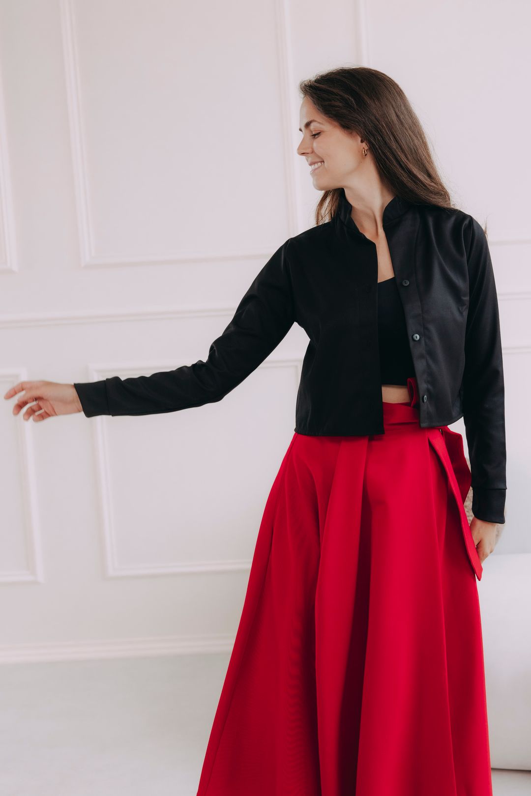 Černá a červená. Dvě barvy, které si spolu nikdy nešeptají, ale mluví nahlas. Tento outfit sází na osvědčený kontrast. Sukně Mawe Red je jako dobře mířený kompliment – výrazná, ženská, ale pořád praktická. S efektní mašlí a objemem, který se pohybuje přesně tak, jak vy. K tomu minimalistický top Hema Black a navrch krátká košile Tawia Black. Je to ten typ kousku, který podtrhne sílu červené, ale nevezme jí prostor. Může být zapnutá nebo jen tak volně přehozená. Tenhle look je jako espresso bez cukru. Silný a bez kompromisů.