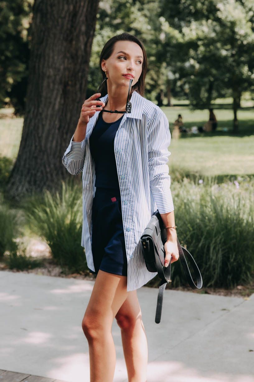 Vykračovat si ulicemi v tomhle outfitu možná chce na první pohled trochu odvahy, ale věřte, že se vyplatí ji v sobě najít. Navy komplet složený z neuvěřitelně příjemných a zároveň lichotivých kraťasů a univerzálního topu Selas vytváří prudce ženskou siluetu, ke které vám bude perfektně kontrastovat maskulinní oversized košile Gauri. Proužky jsou módním evergreenem a zrovna v téhle kombinaci se vyjímají naprosto dokonale. Zkuste namixovat outfit, který působí suverénně, tak trochu rozpustile, a přitom z něho vyzařuje elegance na míle daleko. Na námořní míle daleko.