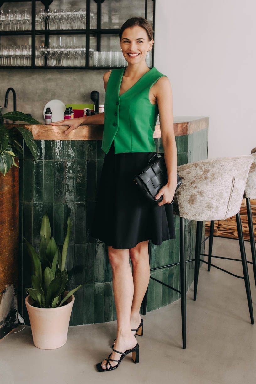 Vesta na holém těle. Punc devadesátek budeme tomuto módnímu počinu těžko upírat. A není ani důvod, z každého období se prostě vrací ty nejlepší trendy. Zapomeňte na kostýmkové kalhoty, kombinací vesty Taraji s áčkovou sukní Binju vykouzlíte perfektní outfit, se kterým zabodujete v práci, stejně jako na večerním rande. Když k tomu vsadíte na ostřejší zelenou a temnou černou, nespustí z vás oči ani partner obchodní, natož ten váš. Vylaďte svůj styling decentními šperky, černou kabelkou a je skoro hotovo. Protože takhle, my sice víme, že tenisky jsou tenisky, ale… uznejte, že podpatky dodávají tomuhle odvážnému outfitu tu pravou šťávu. Perfektní, nemyslíte?