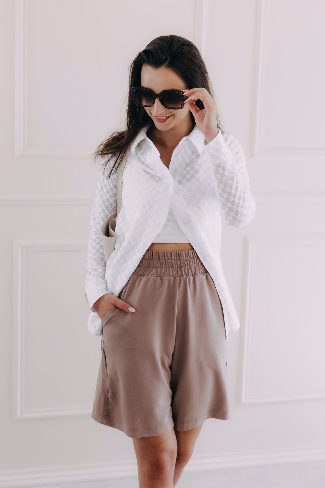 Ne každý den máte chuť na přiléhavé střihy. A právě tehdy přichází na řadu kombinace, která si s létem rozumí i bez velkých slov. Kraťasy Meema Beige mají volnost, kterou v létě potřebujete, ale zároveň si zachovávají tvar i styl. Jsou dostatečně ležérní na ranní pochůzky, ale když v nich prosedíte celé odpoledne u stolu, stále se cítíte dobře. Béžový tón slibuje, že je sladíte se vším, co vytáhnete ze skříně. Třeba s efektním topem Hema Ecru, který nepotřebuje výstřihy ani volány, aby působil žensky. Madeirová košile New Tawia je jako volný čerstvý vánek s jemným nádechem romantiky. Rozepnutá, uvázaná nebo přehozená přes ramena – oblečte si ji tak, na co máte právě náladu, nebo podle toho, kam zrovna spěcháte. Celý outfit má v sobě něco dovolenkového, ale klidně vám bude dělat společnost i během odpoledne, které chcete strávit po svém.