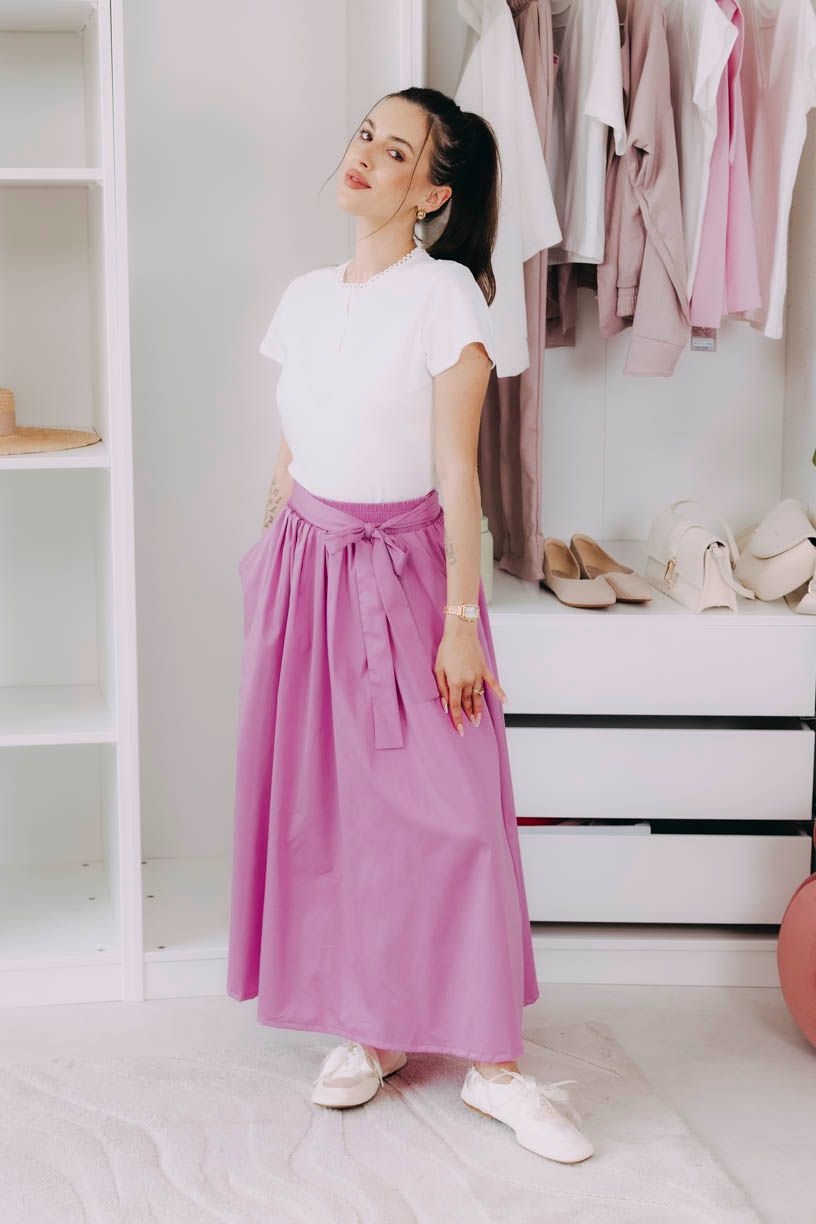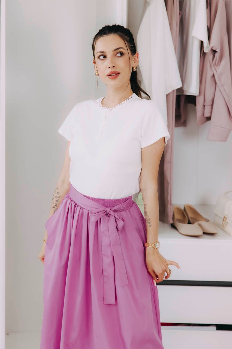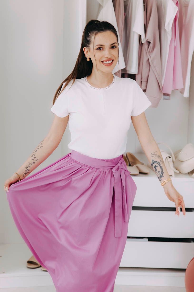 Jako výkřik radosti uprostřed obyčejného dne. Se smíchem, který je slyšet dřív, než vstoupíte do místnosti. Protože když se objevíte v sukni Tumpe Pink, jednoduše záříte. Široká, pohodlná, s nenápadně praktickými kapsami a výraznou mašlí v pase. Doprovází ji jednoduché tričko Kofi Ecru, které tvoří ten správný kontrast, aby růžová mohla naplno vyniknout. A jako pověstný „mistrovský tah“ outfit završuje krátká bílá košile Tawia Short – ve svém postoji tak trochu francouzská: uvolněná, ale promyšlená. Zkrátka radost, kterou si oblékáte.
