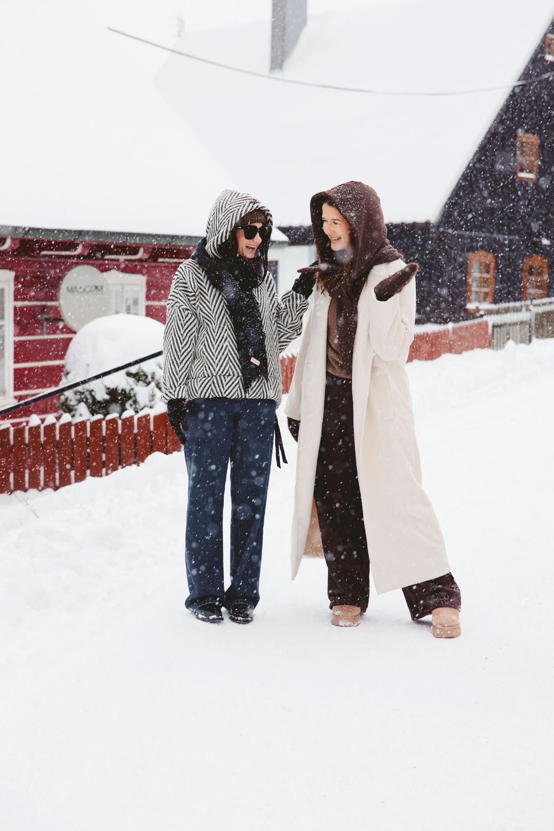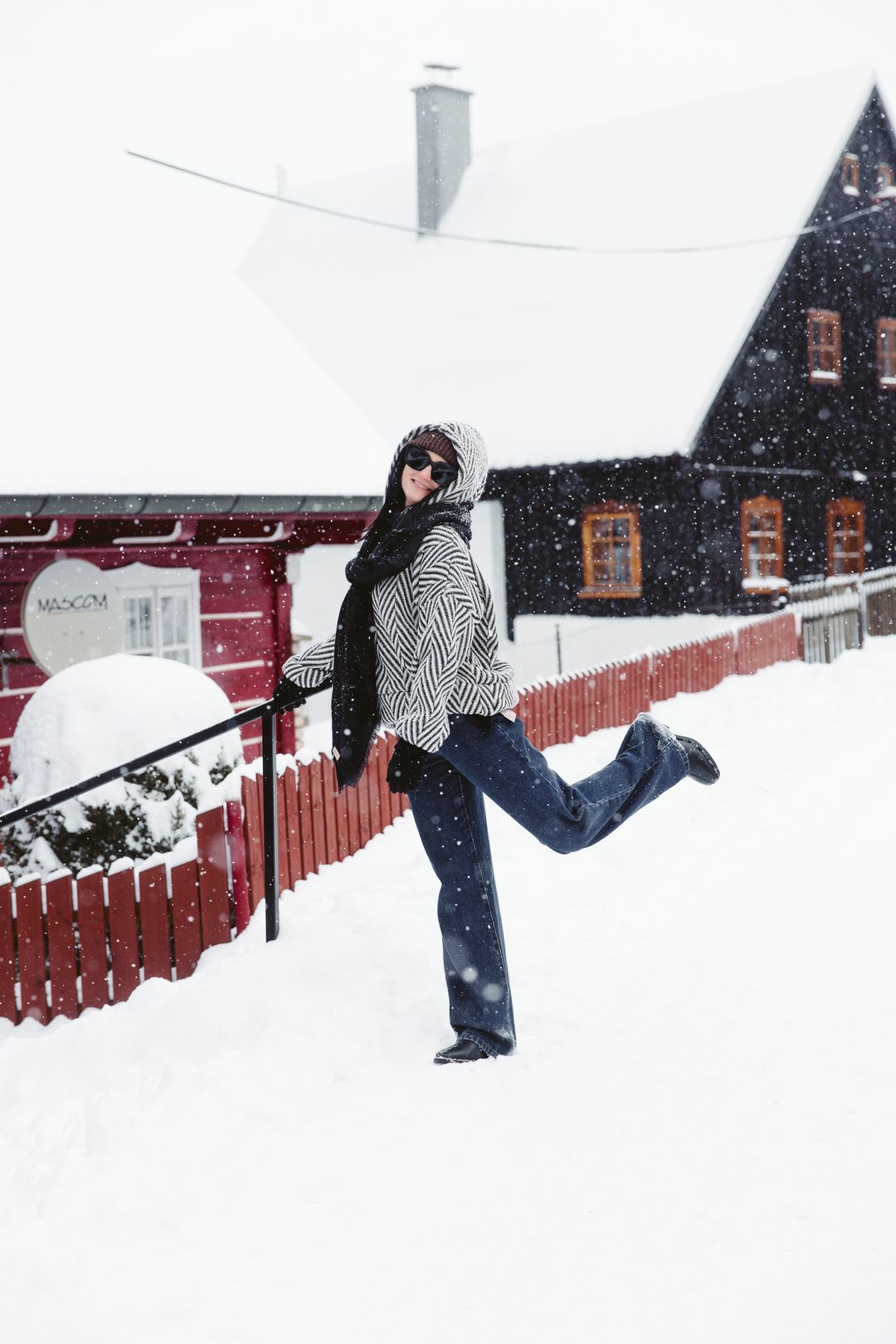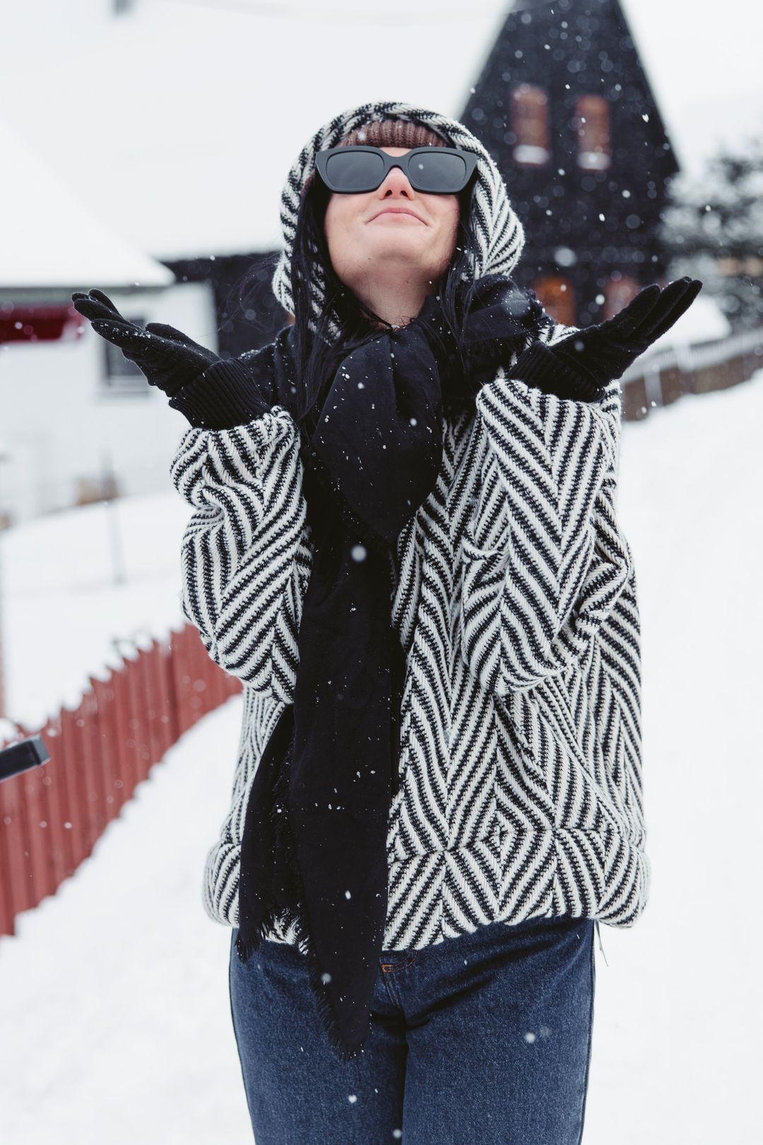 Kdo říká, že džíny do sněhu nepatří? Naopak! Naše denimky Nola jsou pro zimní vrstvení jako stvořené. Mají skvěle střižené široké nohavice, pod které hravě schováte termoprádlo nebo punčocháče, aniž by to ubralo na stylu. V kombinaci s mikinou Moussa a výrazným vzorovaným svrchníkem vytváří siluetu, která je moderní a neotřelá. Černobílý kontrast a široké nohavice jsou jasným vzkazem: vím, co se nosí, a zima mě nezastaví.