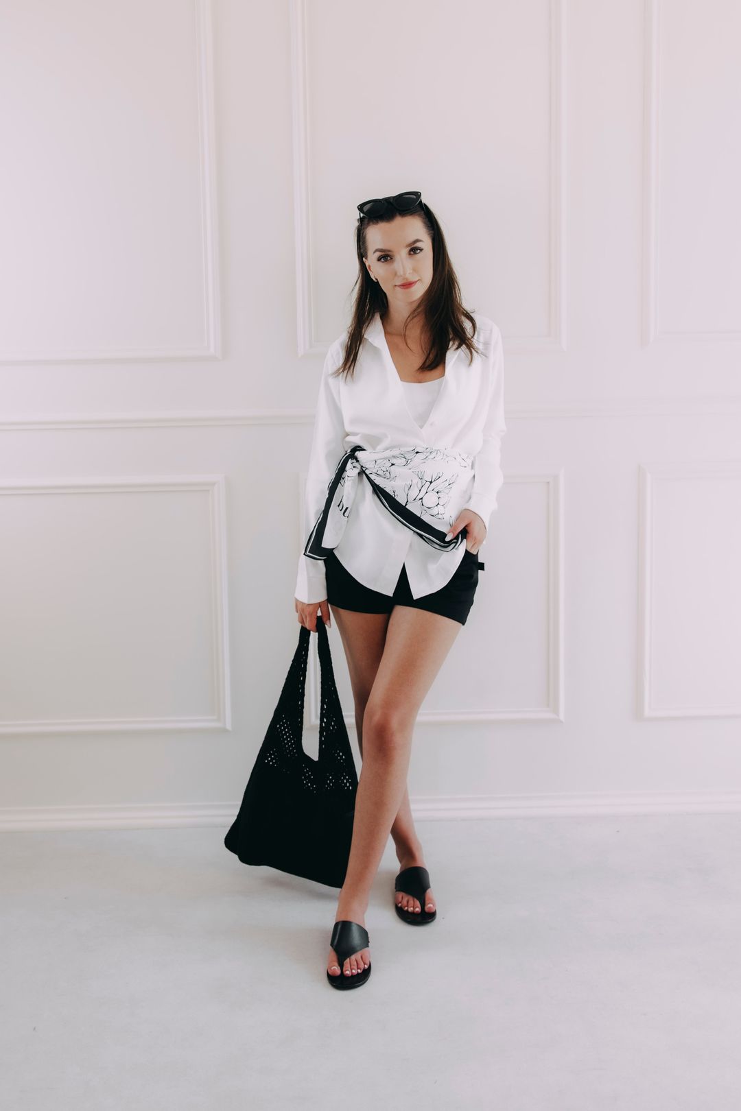 Někdy se obléknete jen tak, jak vám to přijde pod ruku – a vznikne z toho něco, co má nečekaný šmrnc. Černé kraťasy Selas Summer se tváří nenápadně, ale jakmile si je jednou obléknete, zjistíte, že lepší střih jste už dlouho neměla. Měkký materiál a pohodlí bez kompromisů. Doplněné minimalistickým topem Hema a skvěle padnoucí košilí Tawia. Můžete ji nechat rozepnutou, zastrčit jen jeden cíp nebo uvázat do uzlu. V každé variantě působí stejně ležérně. Tentokrát jsme přidali detail v podobě šátku uvázaného v pase. Není to jen praktické – je to hra. S barvami, s tvarem, s vlastním stylem. Na dopolední kávu, večerní toulky městem i dny, kdy nepotřebujete nic víc než pár kousků, ve kterých – jste to prostě vy.