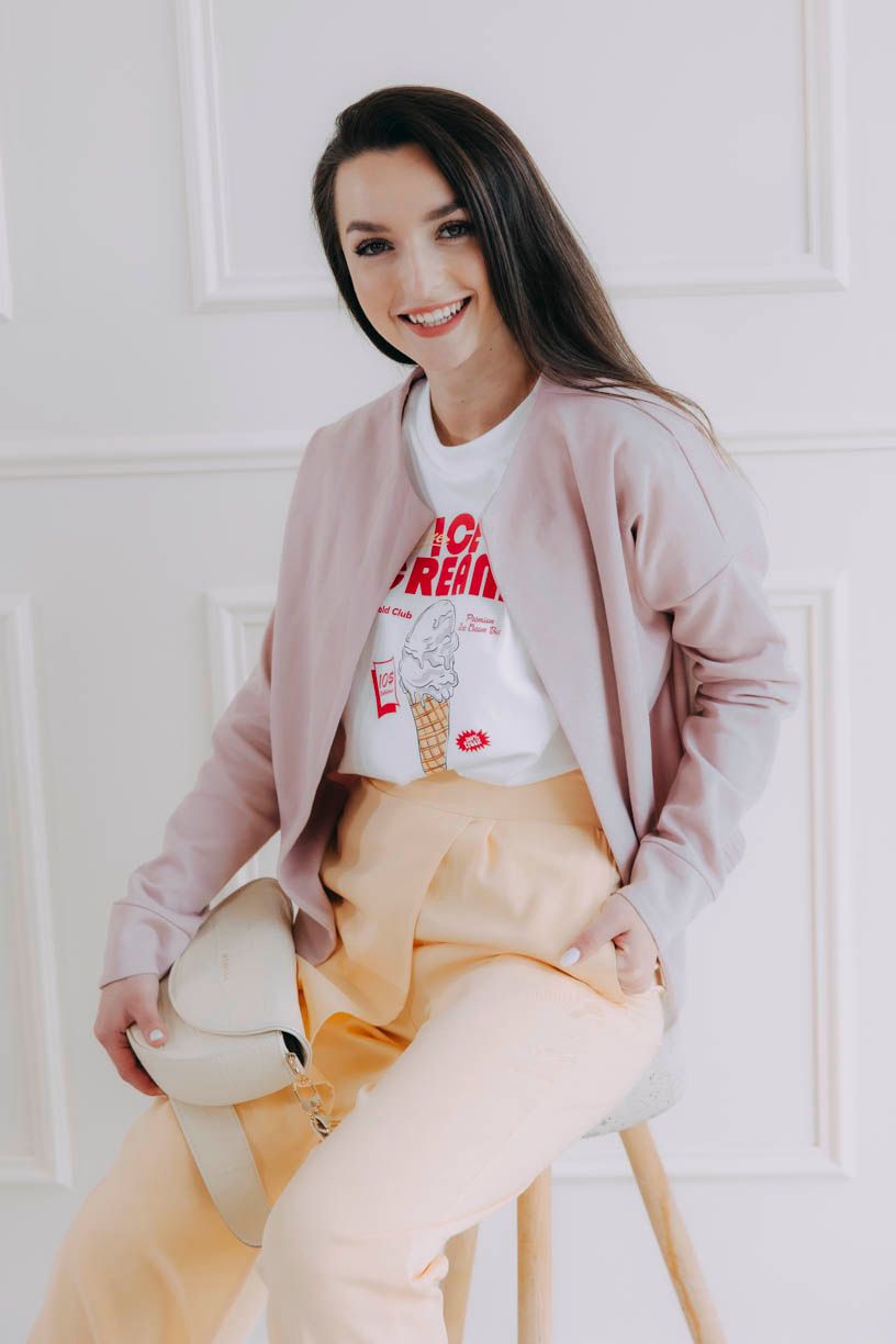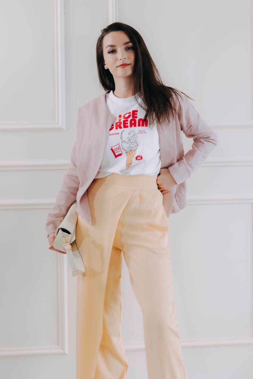 Nechte se unést něžnou vlnou pastelových tónů. Kalhoty Aminata Butter s rafinovaným předním překrytím vytvářejí elegantní dojem zavinutí a zároveň zajistí, že se jako pravá lady nemusíte obávat nečekaného poryvu větru. V kombinaci s hravým tričkem Mood White Ice Cream získává outfit lehkost a letní šmrnc. A pudrově růžový blejzr Nomusa Summer Light Pink? Ten dodává outfitu nejen sofistikovanost a něžnost, ale skvěle poslouží i ve chvíli, kdy se posezení na letní zahrádce protáhne do nočních hodin.