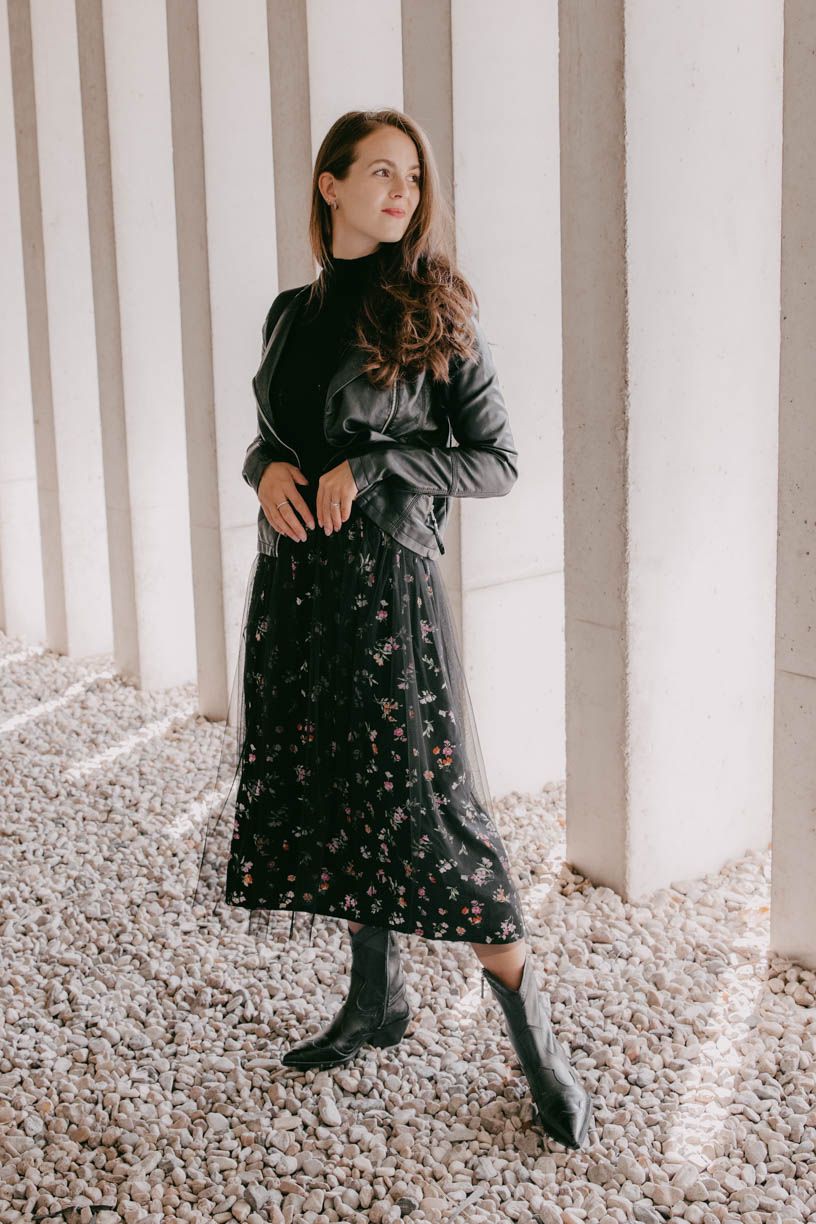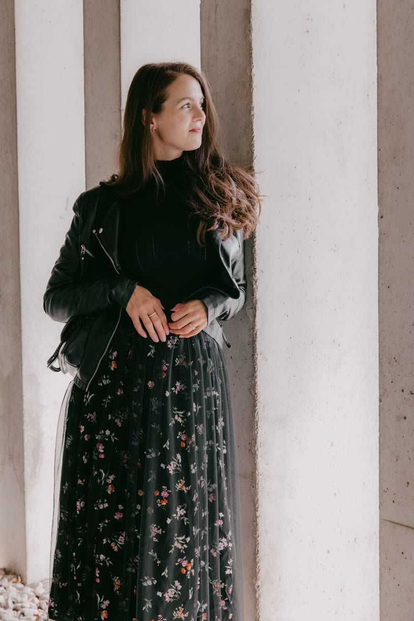 Každá jsme někdy princezna. A každá si to jedem někdy trochu na punk. Právě pro tyhle naše osobnostní rozmary je tu sukně Tia – taky tak trochu plná protikladů. Temně černá, ale posetá romantickými barevnými kvítky, roztomile nařasená, ale s vrchní tylovou vrstvou drze přesahující samotný midi střih. Pohodlná, výrazná a svérázná sukně pro rebelky každým coulem. V kombinaci s klasickým rolákem Elton budete působit suverénně, ale pořád velmi elegantně. Jestli máte v šatníku koženou černou bundičku, nebojte se ji obléknout právě k téhle dvojce. Když k tomu ještě nazujete kožené boty, váš look pak bude naprosto nekompromisní. A to vy přeci jste, no ne?