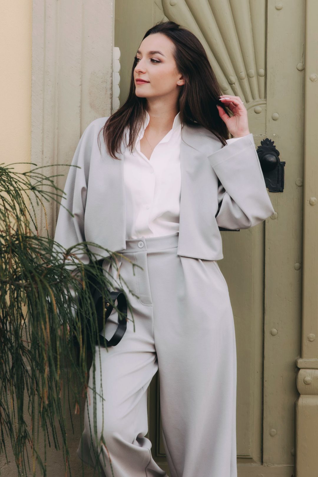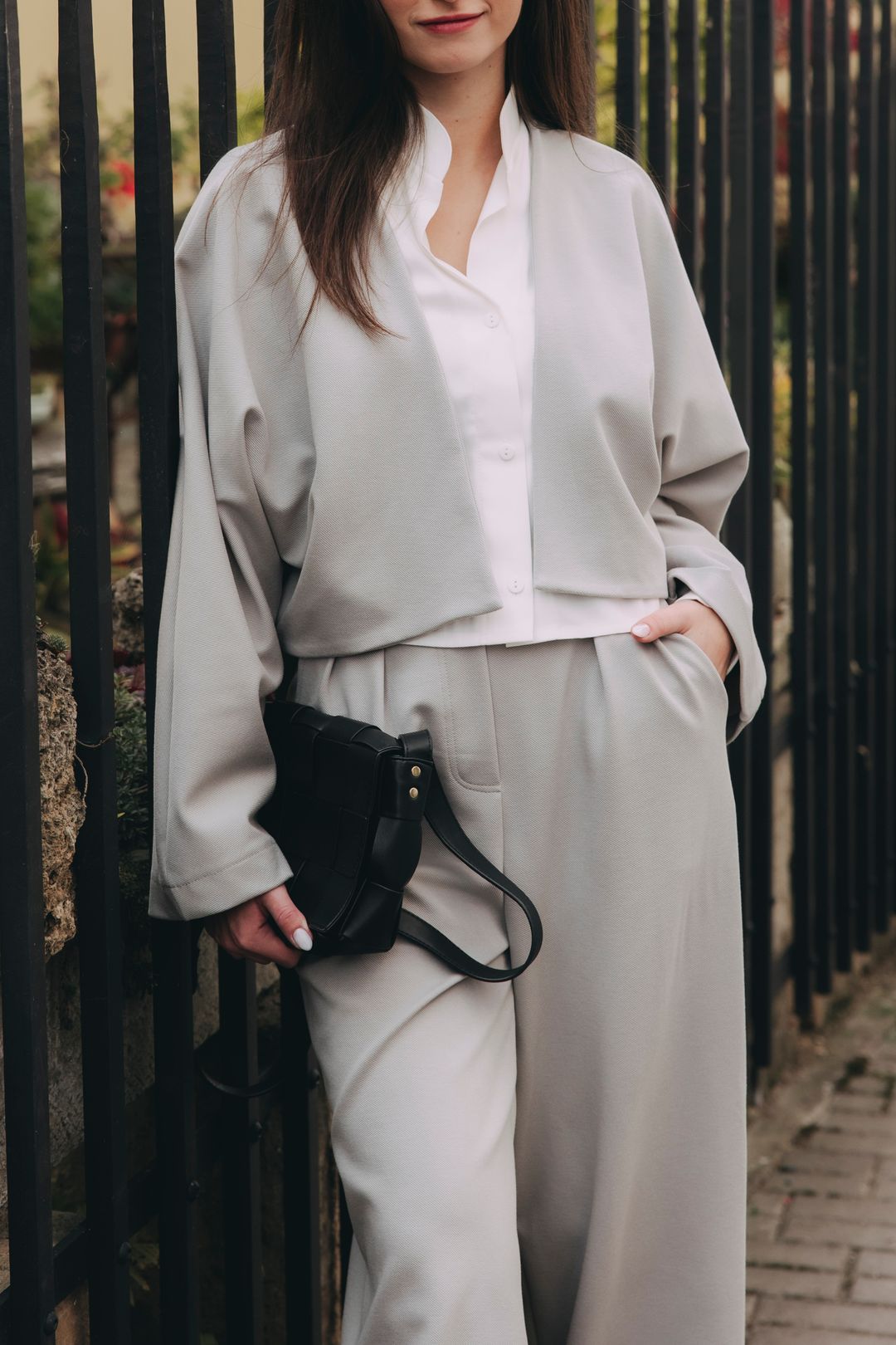 Široké kalhoty plynule navazují na blejzr, který se ladně nese kolem těla – celek, který nic nepředstírá, jen dokonale funguje. Stačí přidat bílý top, tričko nebo košili z kolekce White Tee a celý outfit se rozzáří ještě víc.