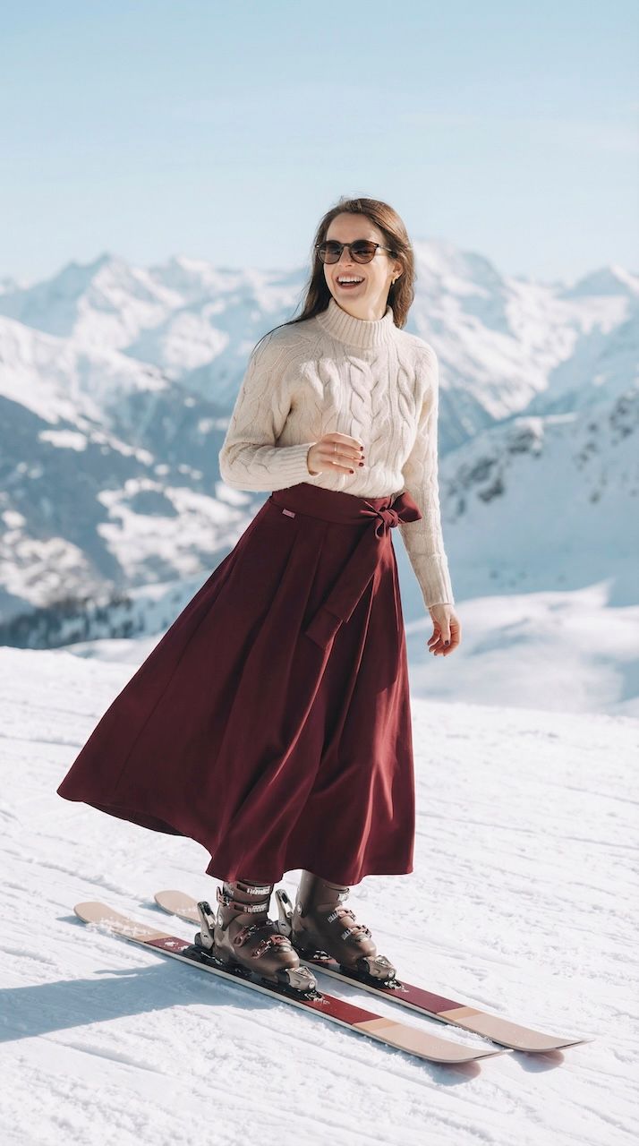 Hluboká vínová barva sukně vytváří nádherný a luxusní kontrast s čistě bílým sněhem. Aby byl look dokonalý a vy se cítila jako v bavlnce, doplnili jsme ji naším svetrem Amea Nude. Ten je ztělesněním jemnosti, hřejivosti a nadčasového stylu.