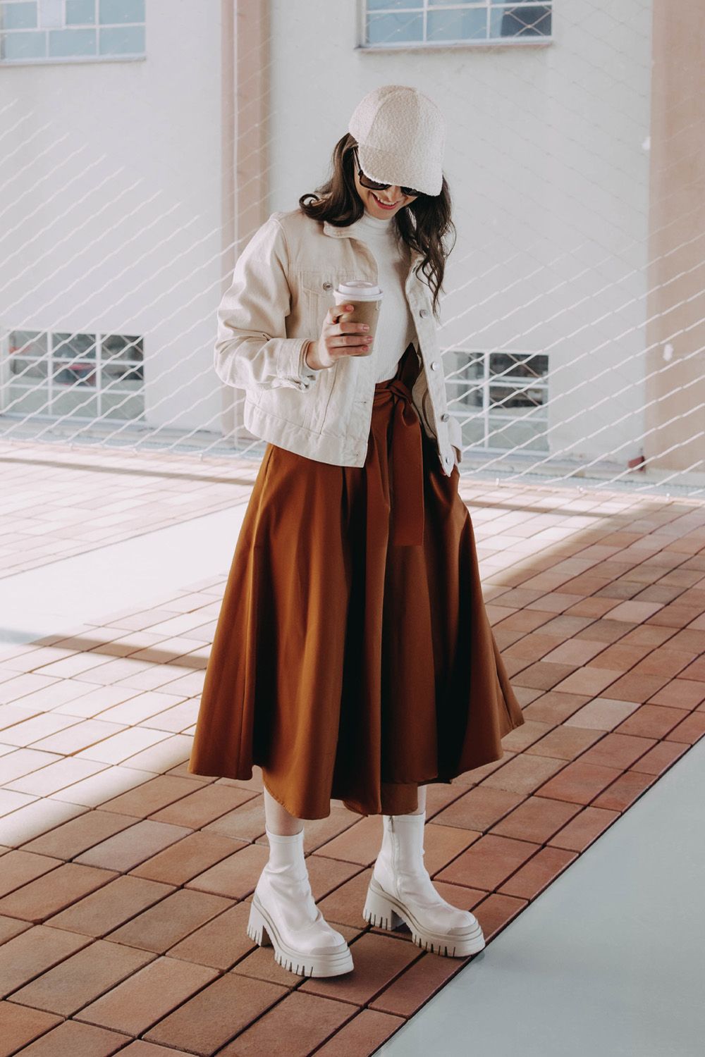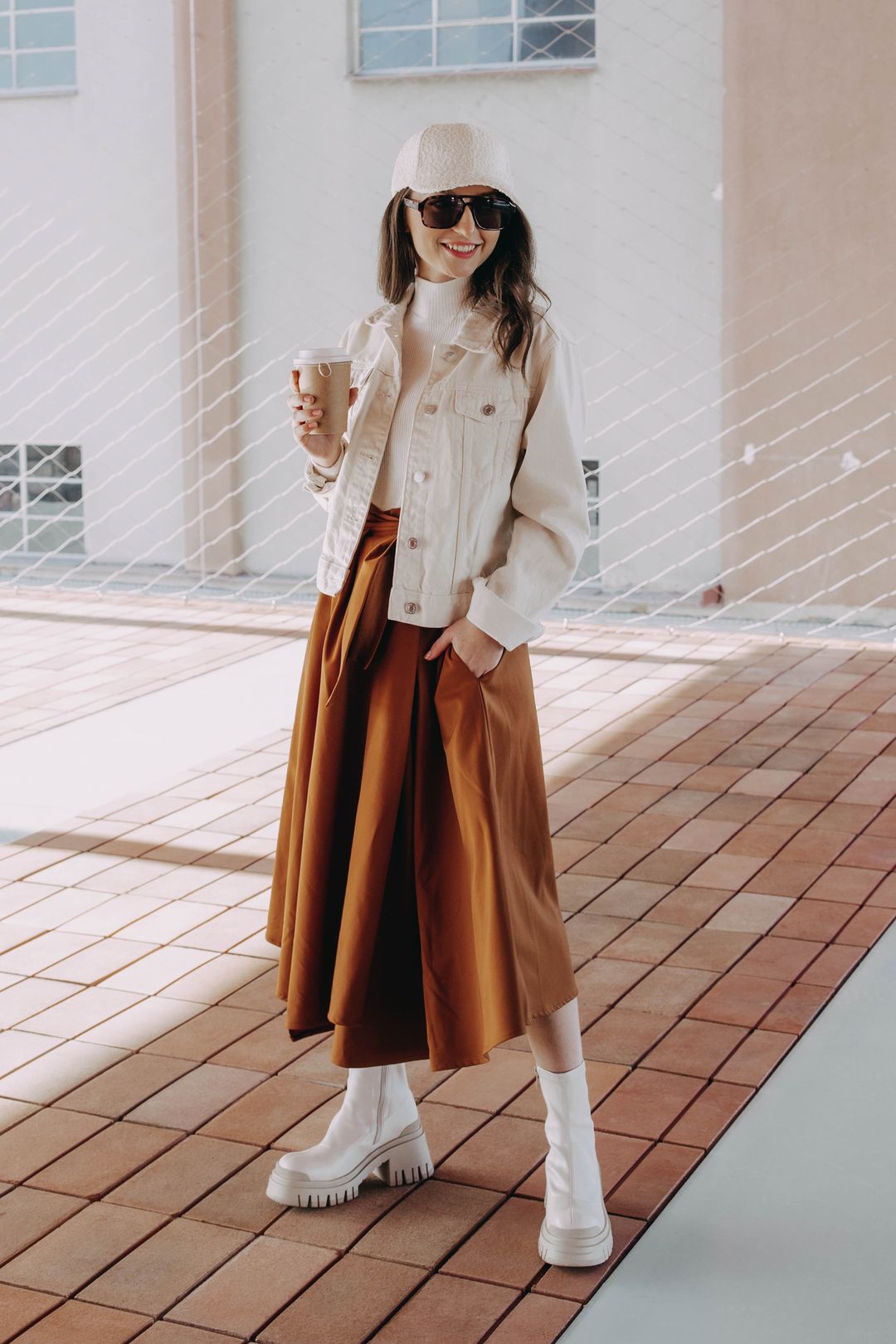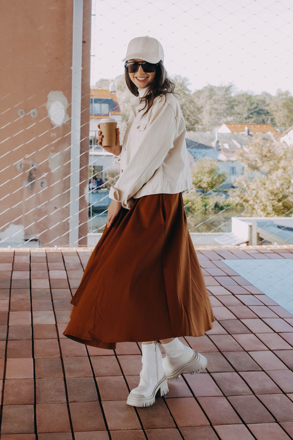 Jestli máte něco za lubem, tvařte se hlavně nenápadně. S outfitem, ve kterém zapadnete, vám my ovšem nepomůžem. Tak se radši naopak zřetelně usmívejte a nechte okolí obdivovat svůj módní důvtip v téhle koňakové zavinovačce Mawe doplněné o světlé kousky. Kačka třeba sáhla po osvědčeném roláku Slam, přes který jí stačila lehoučká přechodná džíska. Inspirujte se u ní a pojistěte se nějakým výstřednějším typem bot, zateplenou kšiltovkou a samozřejmě nějakou horkou dobrotou do ruky. A pak klidně začněte tropit, co se vám zamane…