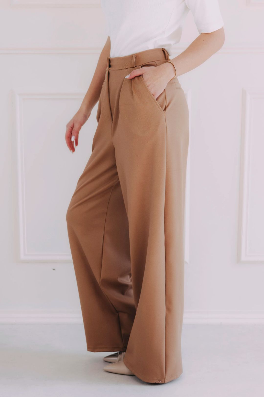 Camel odstín má v sobě klid podzimu i vstřícnost odpoledního slunce. Je to komplet, který zjemní každý pohyb a dodá jakýsi hřejivý pocit i v tom nejrychlejším tempu během dne. Kalhoty se nesou s elegancí a pohodlím, blejzr přidává smysl pro detail a celý look nenápadně změkčuje. Když pod něj přidáte bílé tričko, košili nebo top z kolekce White Tee, vznikne kombinace, která působí přirozeně, svěže a vždycky chic.< Camel – barevný tón, který je odrazem sebejisté ženy: dokazuje, že si jemnost umí stát za svým.