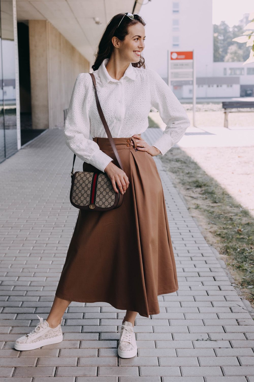 Fandíte přírodním odstínům? Bingo! Nemusíte totiž nosit výstřední barvy, abyste v ulicích patřičně zazářila a užívala si zájmu okolí. Tahle působivá oříškově hnědá dokonale sedí k dírkované madeiře. Sukně Luo nejenže krásně zdůrazní pas, ale taky se příjemně nosí. Košile Yuma pak zaujme kromě materiálu i decentním řasením, které celý outfit perfektně doladí. Ať už zvolíte pohodlné tenisky nebo elegantní podpatky, o uznalé pohledy máte postaráno i v těchto tlumených tónech.