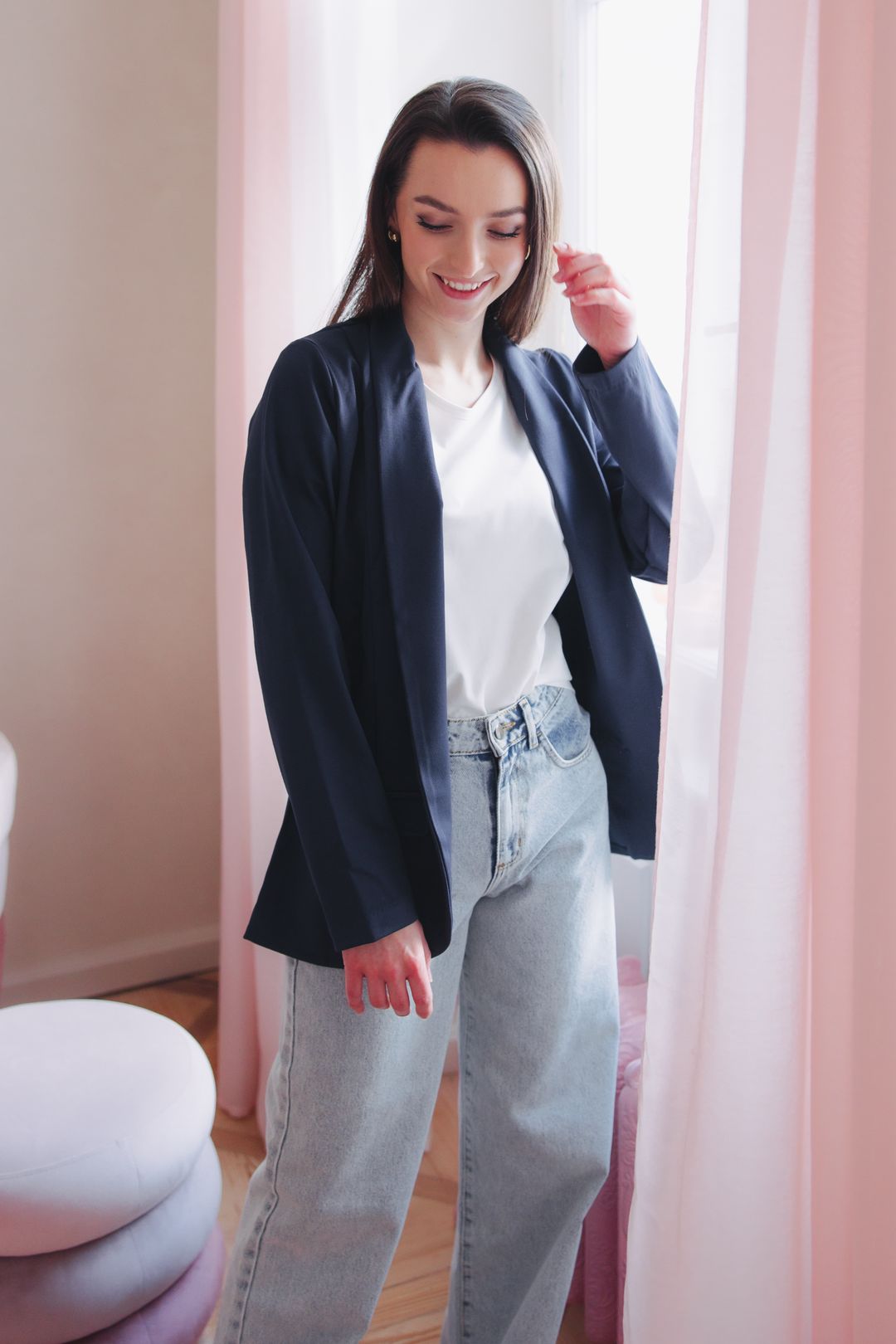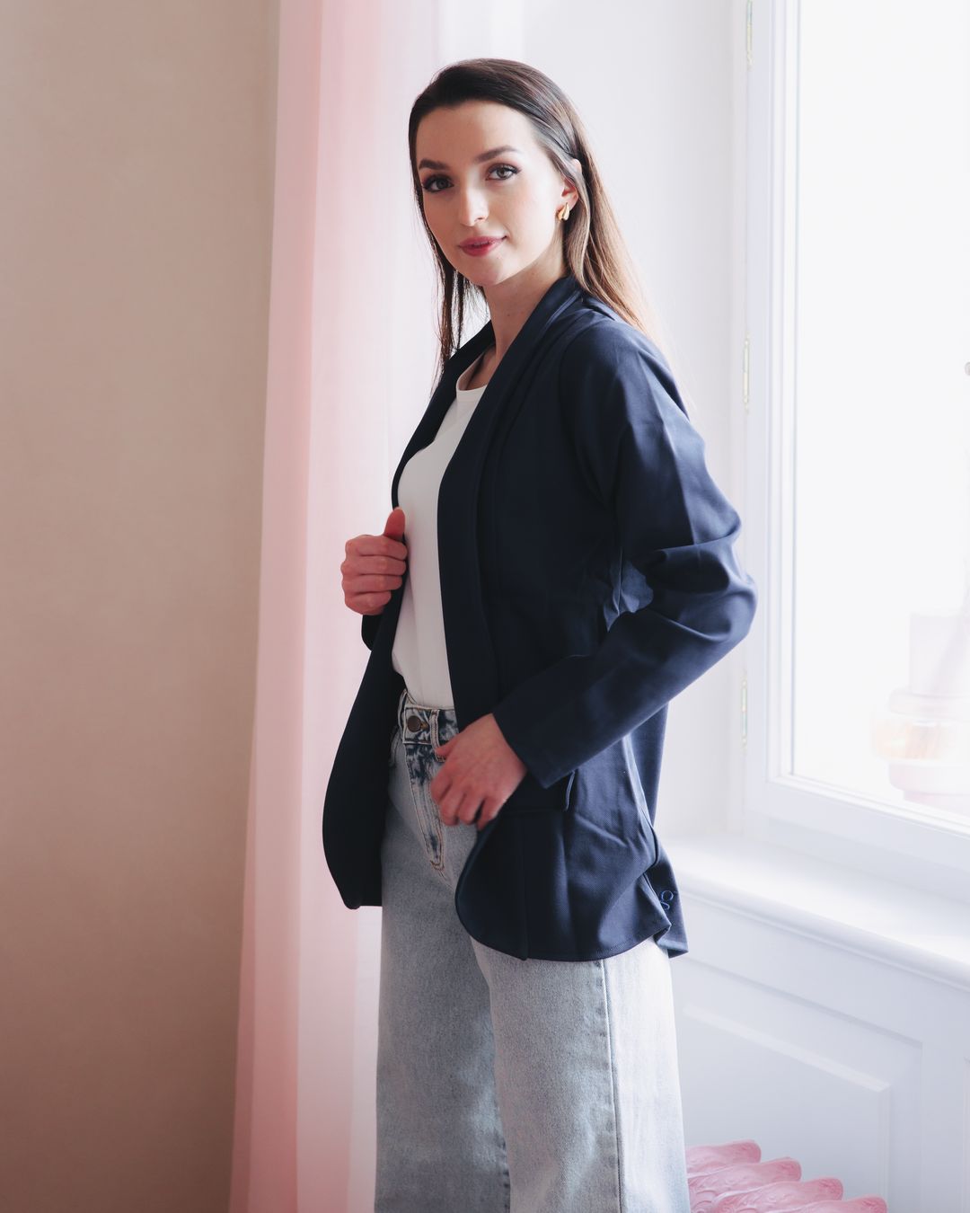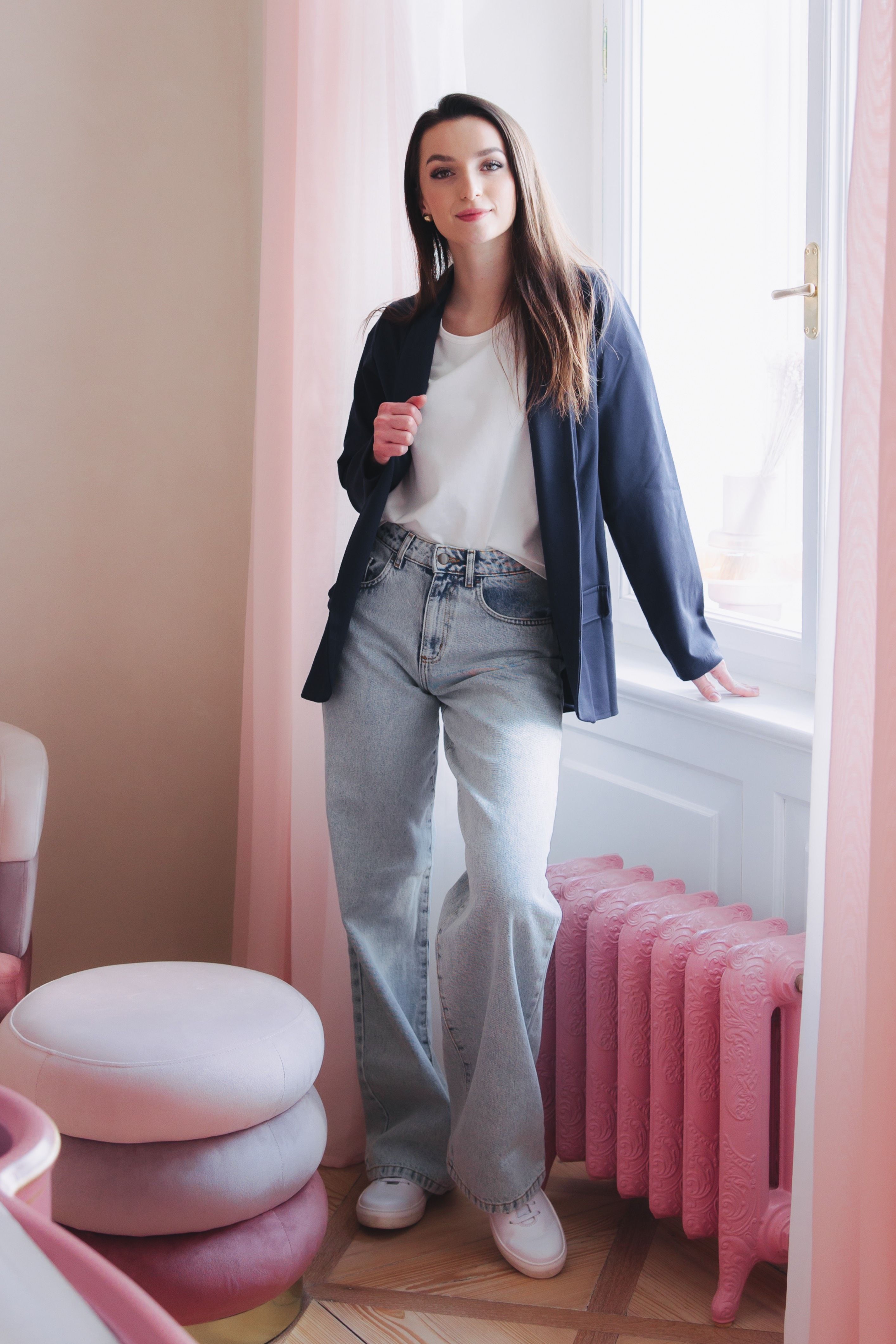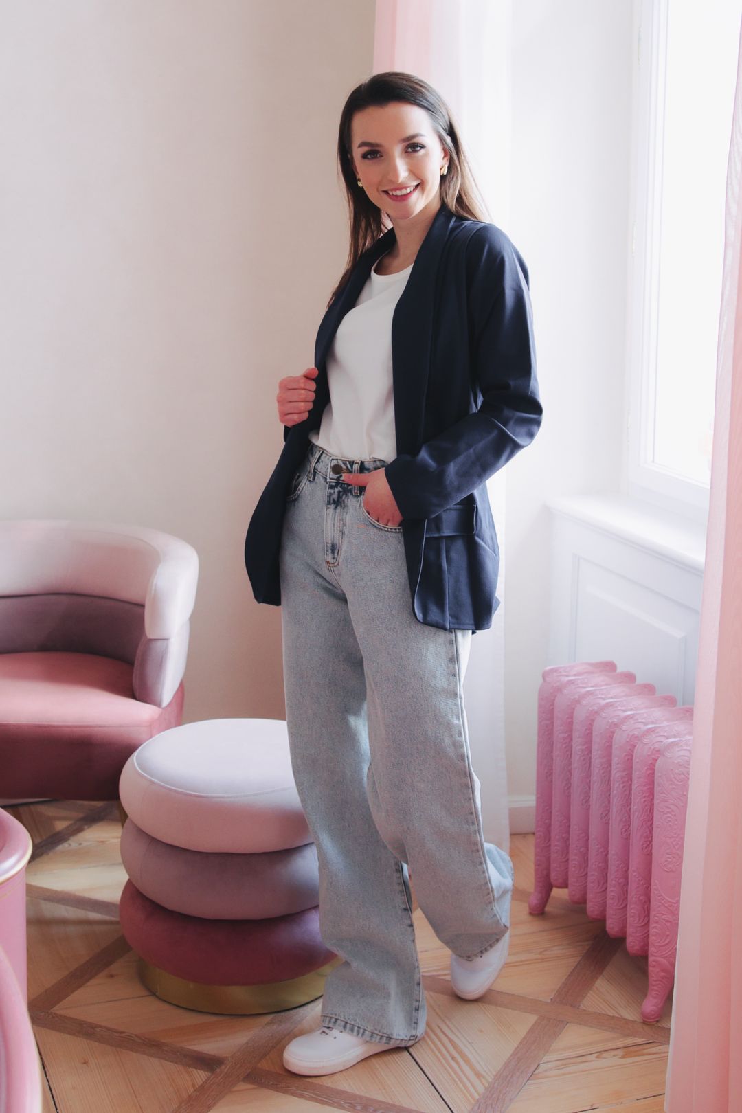 Sako Amadu Navy, Denim Nola Air a tričko Chioma Ecru tvoří základ šatníku, který nikdy nezklame. Elegantní, pohodlné a nadčasové. Tento outfit můžete kombinovat na nespočet způsobů. Bílé sneakers a minimalistická kabelka pak dodají celému looku moderní šmrnc.