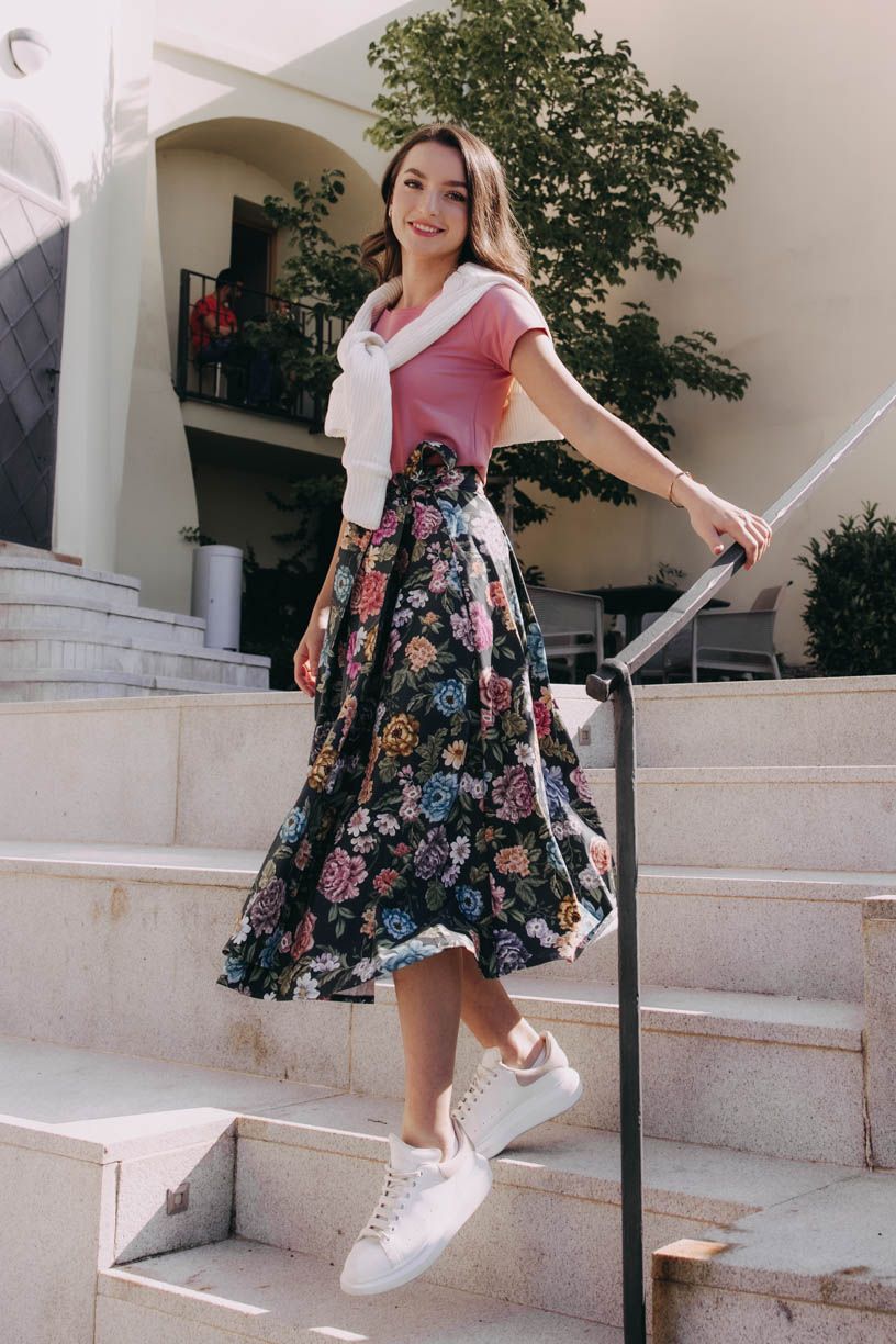 Síla téhle mocně květované zavinovačky tkví v nekonečném množství kombinací, které díky ní vytvoříte. Postačí vám totiž basic tričko v jakékoliv barvě, kterou mezi květy na sukni najdete. Co třeba sladit Mawe s jemně růžovým tričkem Uzio? Je ušité z mimořádně příjemného bambusu, který vás udrží v teple a zároveň svěží po celý den, ať už je jaro, léto, podzim, nebo zima. Ecru odstín svetru Dunia tento outfit krásně rozzáří a dodá mu energický nádech. Obujte oblíbené světlé tenisky a vydejte se radovat ze života do městských ulic, parků, kaváren, galerií… Prostě kam vás vaše otevřené srdce a toulavé nohy zavedou.