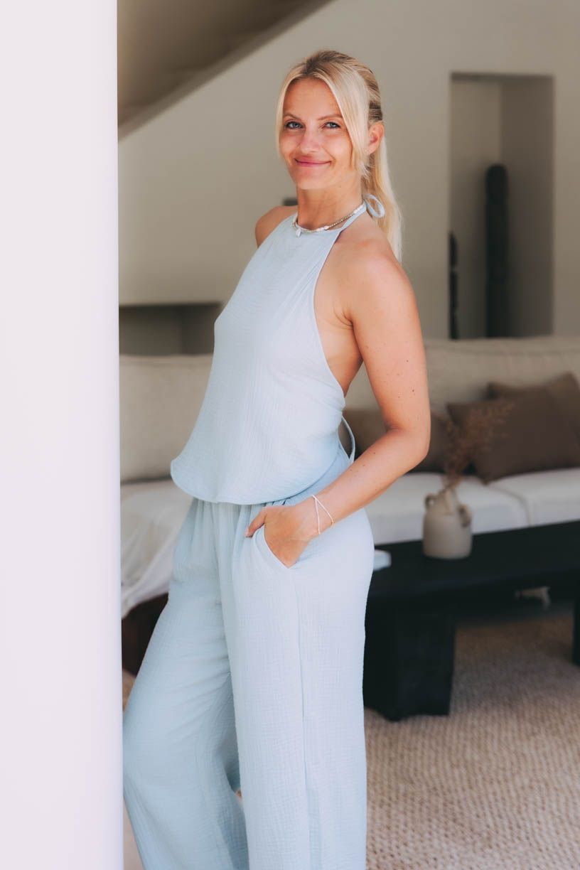 Mušelín, mintově modrá a střihy, o kterých ani nevíte. Zato o vás ví během okamžiku každá bytost v okolí. Bude z vás totiž vyzařovat svěží pohoda a sebevědomí. Na každém kroku. Příjemný materiál doslova hladí po těle a vykouzlí tak celodenní úsměv na tváři nejen vám. Díky dvojitému zavazování si top Vaiva navíc upravíte přesně podle potřeb a kontur své postavy. Odhalená záda působí smyslně, a přitom vůbec ne lacině. A díky kalhotám Gede pak pochopíte, co znamená celodenní pohodlí. Ať už vás čeká výlet za památkami, lenošení s drinkem u bazénu, nebo svoje plány teprve budete spřádat, tahle dvojka je rozhodně top volbou i pro parné dny.