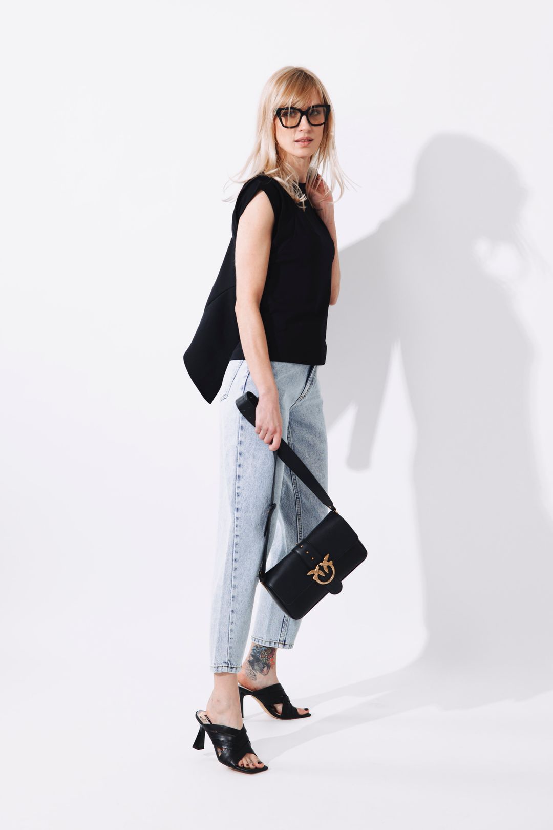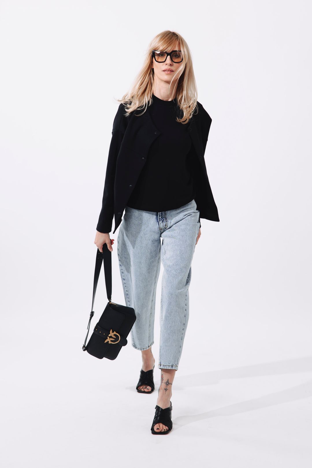 Tento minimalistický urban outfit v sobě spojuje ležérnost i sofistikovanou eleganci a představuje dokonalý základ pro moderní městský šatník. Hlavním pilířem jsou denimové kalhoty Luna ve světlém odstínu, které díky svému uvolněnému střihu zajišťují celodenní komfort a skvěle kontrastují s černým tričkem Kimani, jehož výrazné členění na rukávech dodává celku moderní strukturu a netradiční siluetu. Celý look pak sjednocuje a povyšuje na novou úroveň černý bomber Femi, jenž svou minimalistickou estetikou dodává outfitu potřebný „edge“. Pro dosažení autentického stylu z fotografií doporučujeme kombinaci doplnit výraznými brýlemi, elegantními pantoflíčky na podpatku a kabelkou s kovovými detaily, čímž vytvoříte nadčasový outfit, který vás sebevědomě doprovodí od ranních schůzek až po večerní drink.