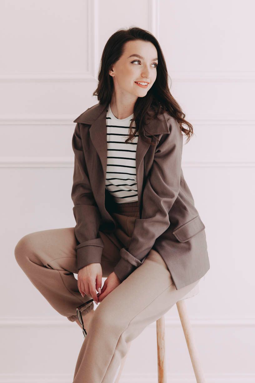Tón v tónu, vrstva po vrstvě. Tento outfit je jako song, který si ráno pustíte a v hlavě vám hraje celý den. Kalhoty Hawa Mocha v jemné kávové barvě hrají základní linku outfitu. Pohodlný střih a příjemný materiál vás provedou celým dnem tak, že ani nebudete mít potřebu hledat něco jiného. K nim se přidává bílé tričko Akifa, které se svými proužky rozděluje monochromatický základ a osvěžuje ho. Sako Ikenna Mocha celý look ukotvuje a spojuje všechny vrstvy do harmonické celistvosti. Přehodíte ho přes ramena nebo necháte rozepnuté? Funguje vždy a všude, bez ohledu na tempo vašeho dne.