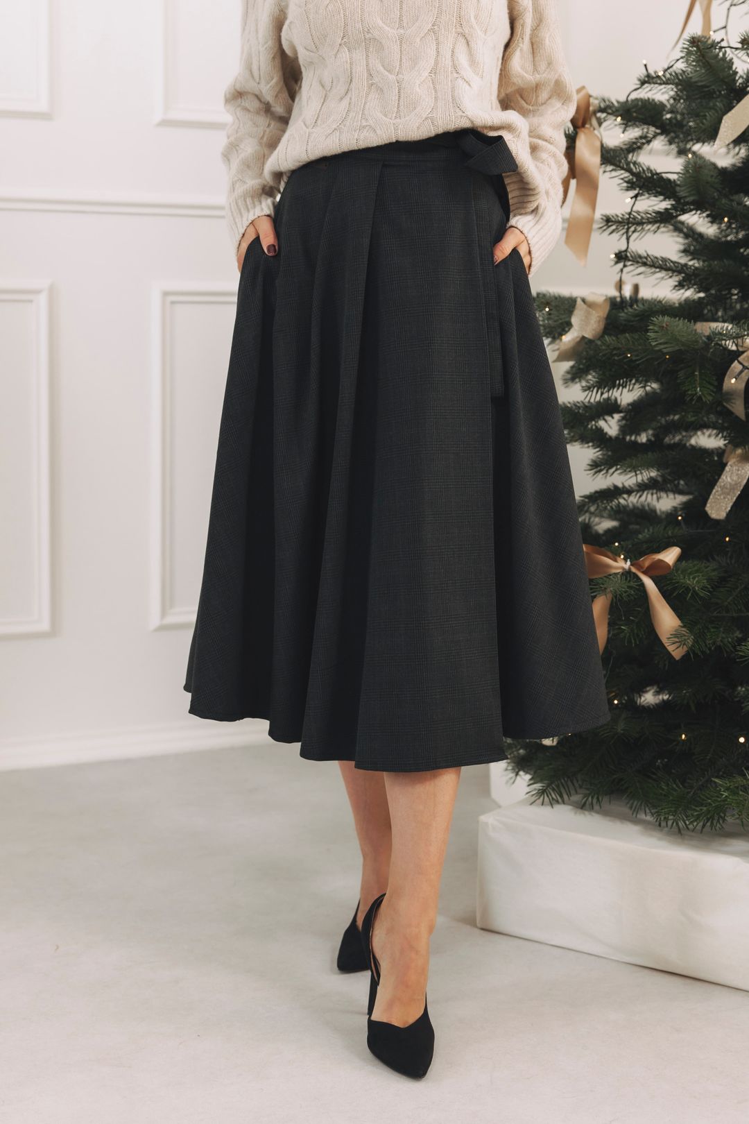 Některá rána si nežádají velká rozhodnutí. Jen něco, v čem se budete cítit příjemně, aniž by to působilo nedbale. Svetr Amea Nude s jemným copánkovým vzorem zahřeje nejen tělo, ale také pohled. Působí útulně, ale díky ladění do neutrálního tónu se přirozeně posouvá i do městského elegantního režimu. Sukně Mawe Grey Cube má mírně rozšířený střih, který vytváří při chůzi plynulý pohyb. Jemná struktura látky dodává outfitu hloubku, která však nepůsobí těžce. Tento look je jako příprava na den, který se může vyvinout různými směry, například na předvánoční brunch či večerní procházku městem pod světýlky. Ani během svátků nemusí být vzácné cítit se pohodlně a přitom stále upraveně.