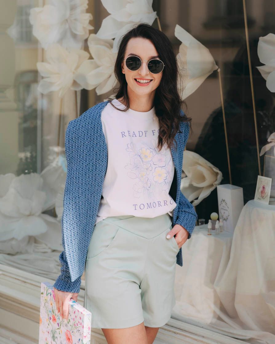 Nepotřebujete přesný plán – jen pocit, že jste připravená. Na náhodný kompliment, ledovou kávu na schodech galerie, ticho ve stínu stromů. Bílé tričko Mood White Tomorrow vám mluví z duše – jemně, ale s jistotou. Kraťasy Selas ve svěží mintové si drží tvar i nadhled. A blejzr Nomusa v denimovém pojetí? Ten si hraje na sako, ale je mnohem víc. Tenhle outfit je jako playlist na shuffle – nevíte, co přijde, ale všechno do sebe zapadne. Chcete být za dámu? Stačí rtěnka a lehký podpatek. Chcete zmizet v davu? Nasaďte brýle. Ale klidně i úsměv. Ať tak, nebo tak, rozhodně jste ready na zítřek, co teprve přijde. A dost možná i na ten, co začíná právě teď.